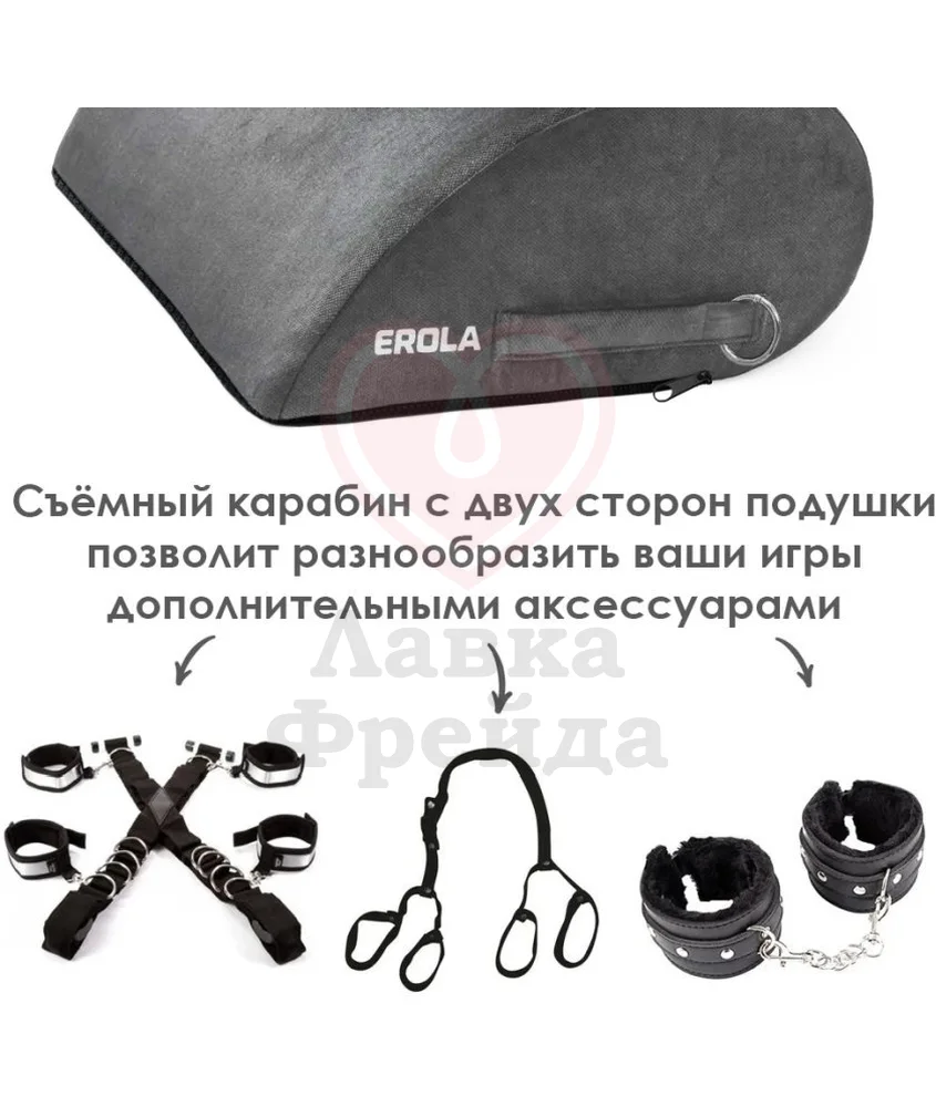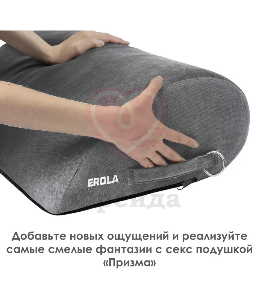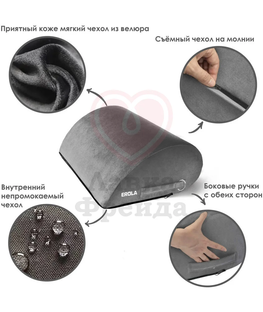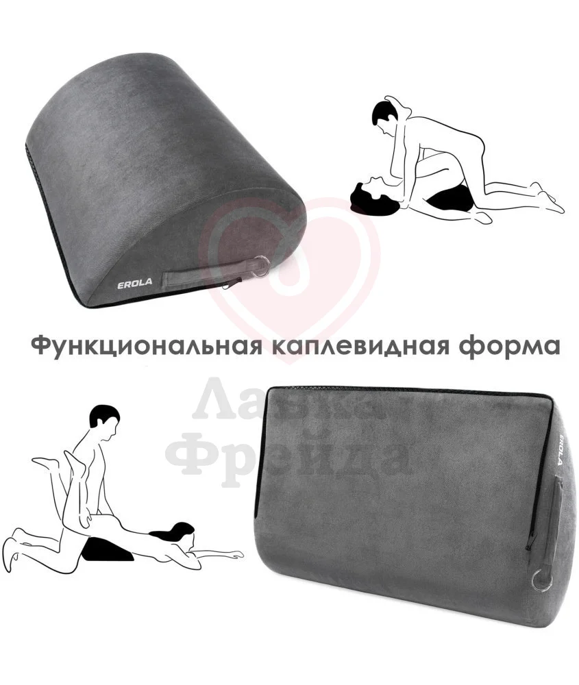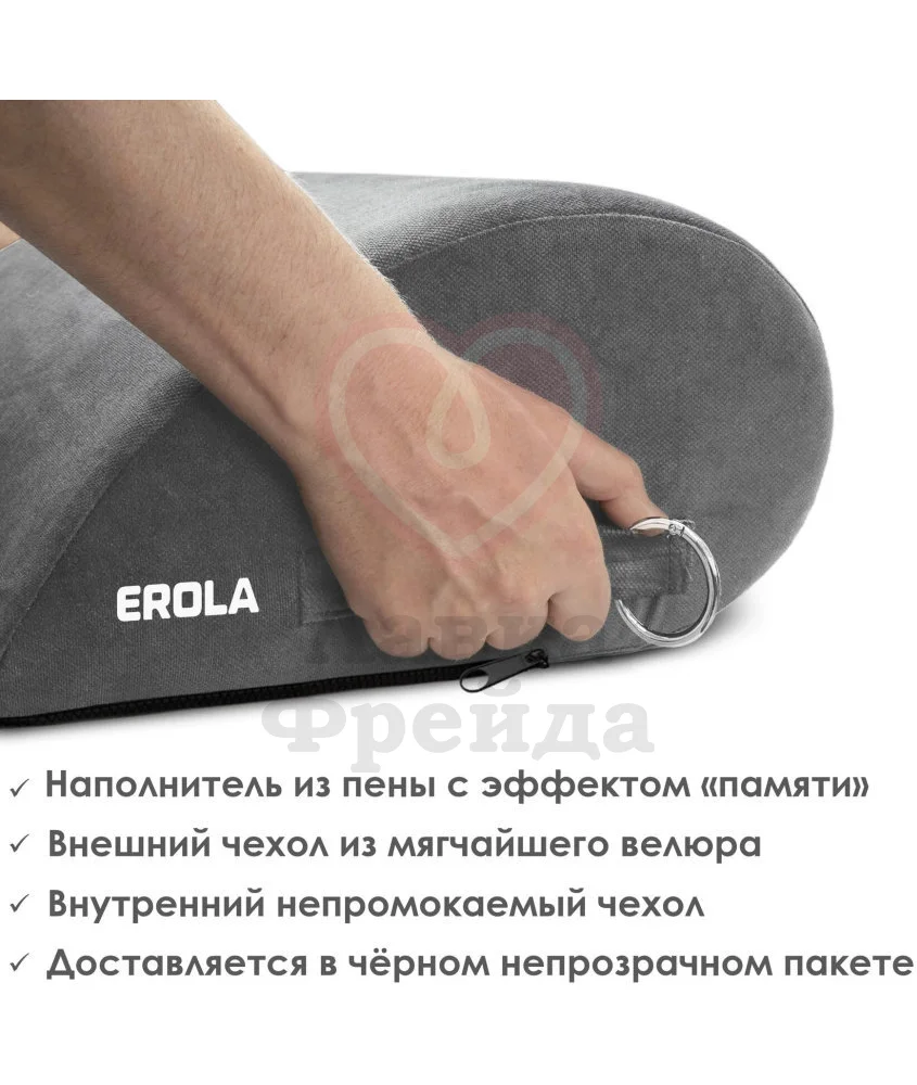 Подушка для секса Erola имеет форму капли, которая обеспечивает идеальный наклон для более глубокого проникновения, освежая старые позы новыми ощущениями. Мягкий чехол из серого велюра нежно прилегает к обнажённой коже ― его можно снять и постирать в машинке при деликатном режиме, а внутренний слой полностью защищён от влаги, что в сочетании с наполнителем из пенополиуретана помогает сохранять изделие сухим и в отличной форме. С обеих сторон есть удобные ручки и съёмные карабины, что облегчает использование и перемещение аксессуара. Используйте подушку, чтобы добавить еще больше красок в вашу интимную жизнь!