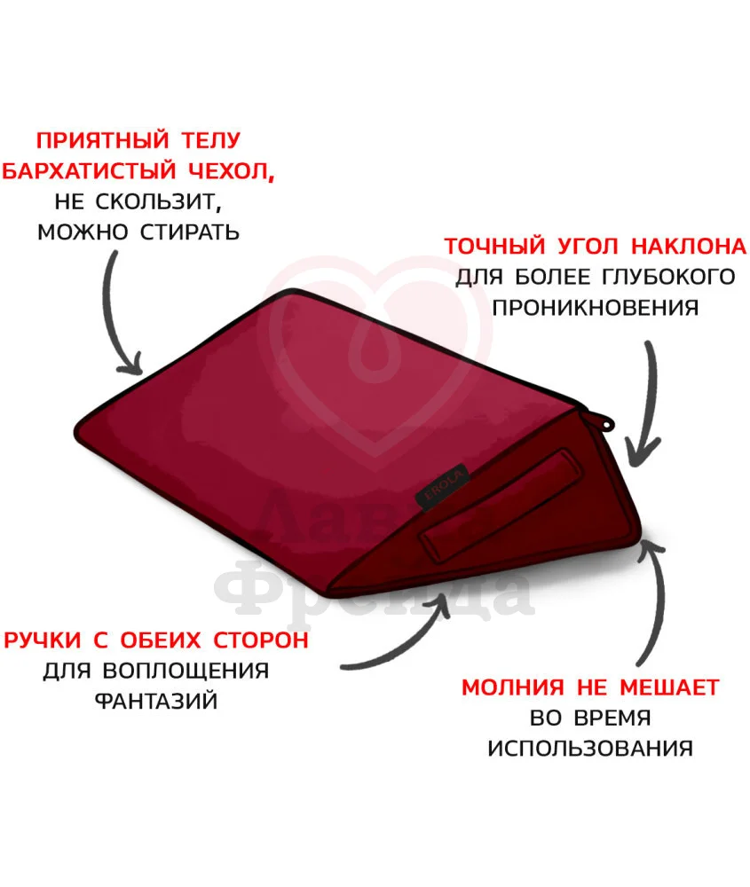Снаружи мягкий чехол из красного велюра, который нежно прилегает к обнажённой коже, даря приятные тактильные ощущения. Внутренняя часть полностью защищена от влаги, что в комбинации с наполнителем из пенополиуретана помогает сохранять изделие сухим и в отличной форме. Используйте подушку, чтобы добавить еще больше впечатлений в вашу интимную жизнь!