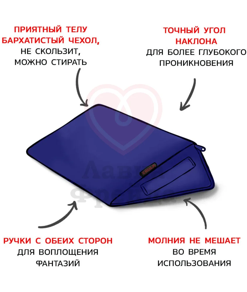 Снаружи мягкий чехол из синего велюра, который нежно прилегает к обнажённой коже, даря приятные тактильные ощущения. Внутренняя часть полностью защищена от влаги, что в комбинации с наполнителем из пенополиуретана помогает сохранять изделие сухим и в отличной форме. Используйте подушку, чтобы добавить еще больше впечатлений в вашу интимную жизнь!