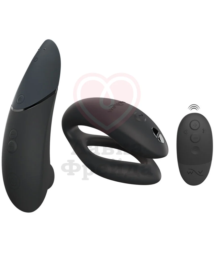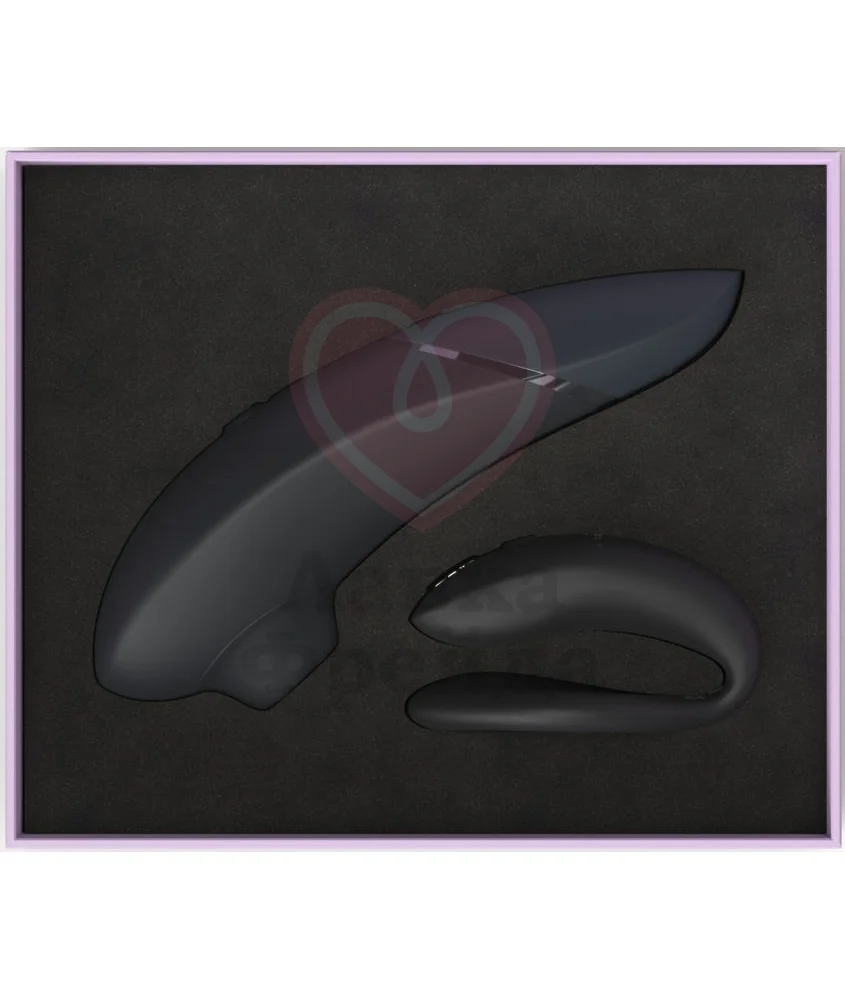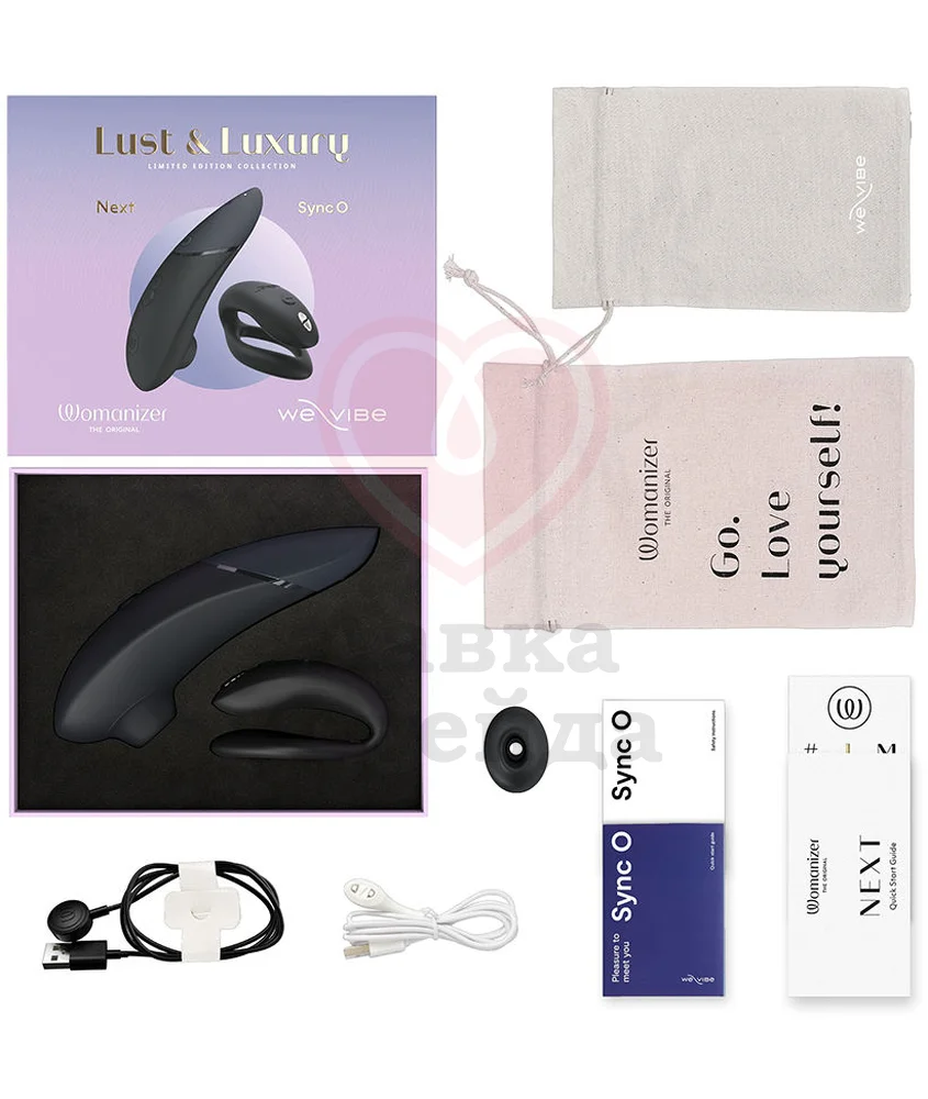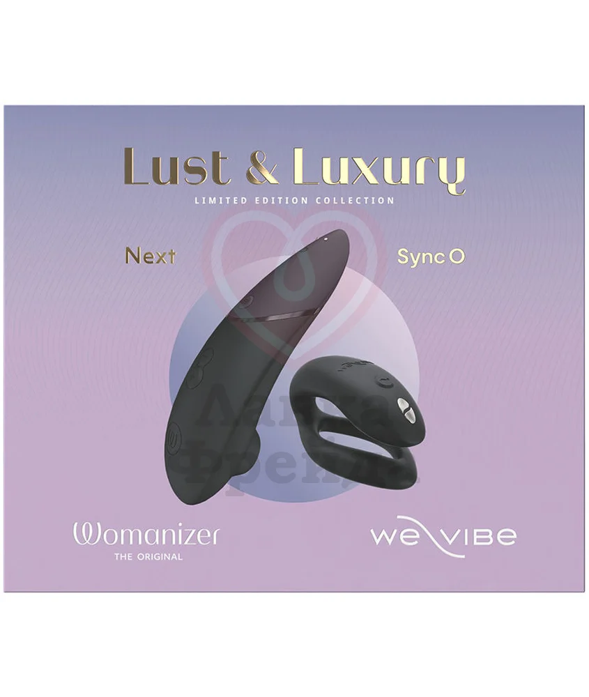 В комплект Lust Luxury входит женский вакуумно-волновой стимулятор Womanizer Next и парный вибратор We-Vibe Sync O, проникающей частью воздействующий на её внутренние эрогенные зоны, а внешней - стимулирующий мужской ствол.