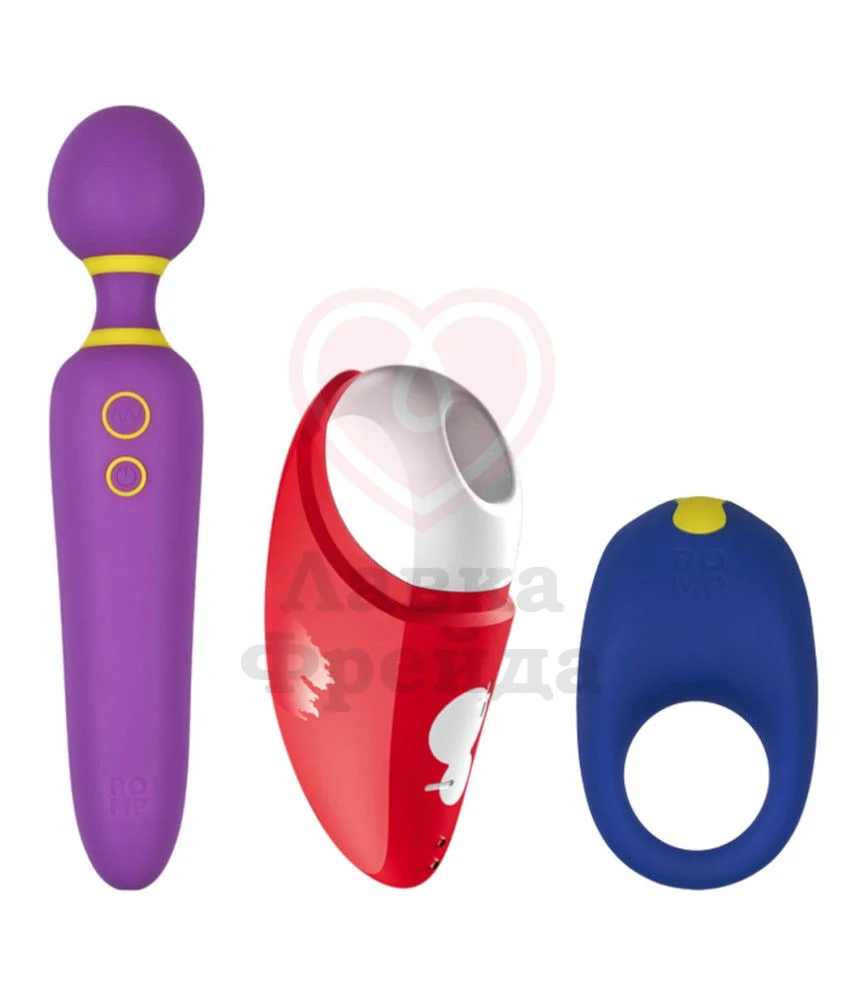 Универсальный набор Romp Pleasure Kit — это три функциональные игрушки в одном комплекте, подходящие как для неё, так и для него. Компактный массажер Romp Flip, вакуумный клиторальный стимулятор Romp Free и эрекционное виброкольцо Romp Juke: каждый порадует своими функциями и возможностями для соло удовольствия или для парной игры.