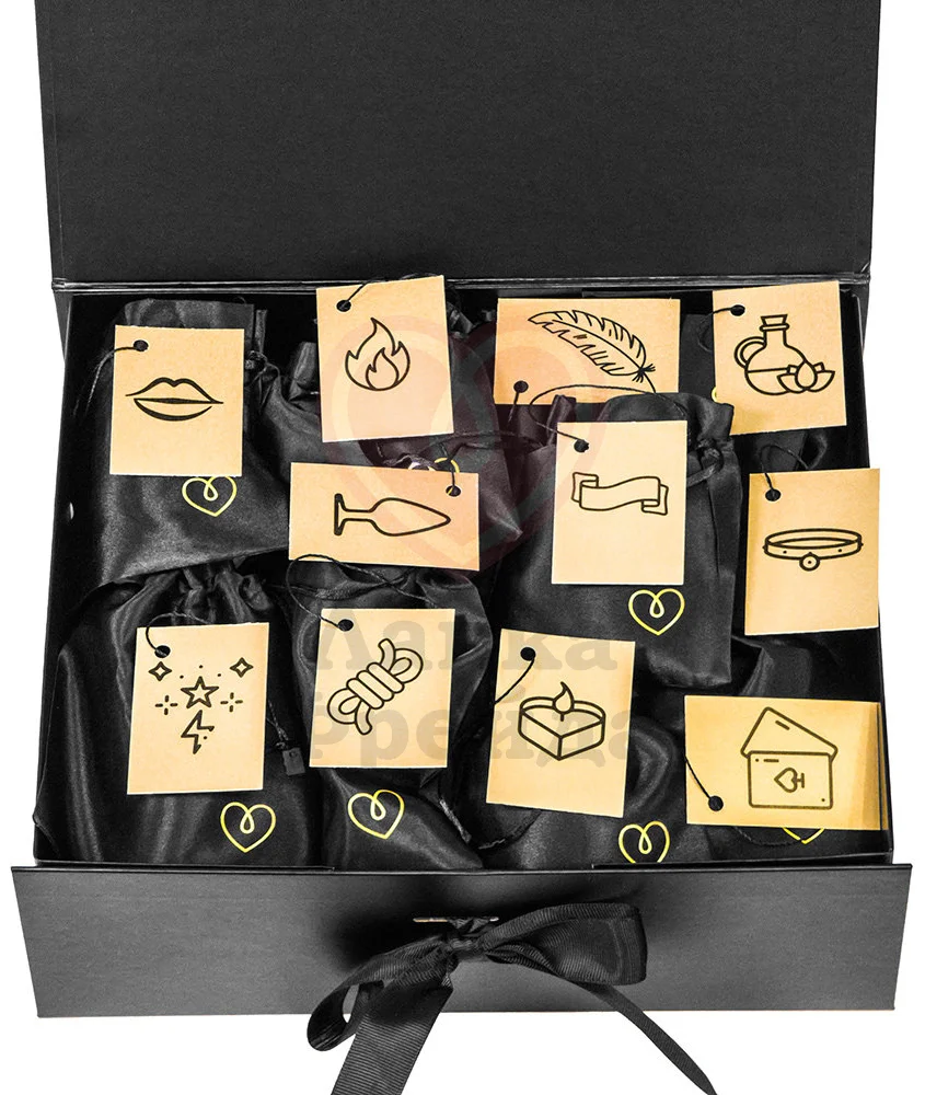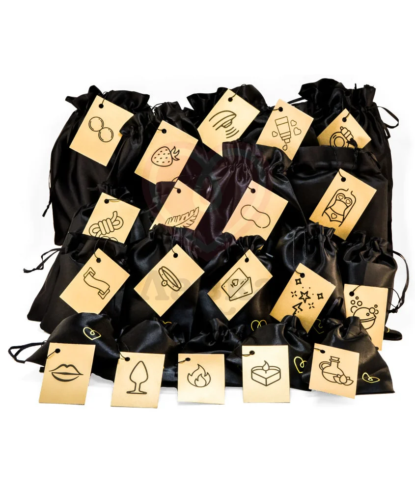 Каждый предмет упакован в фирменный атласный чёрный мешочек, который скрывает содержимое. Сверху только ярлычок с картинкой и мини-сценарием, создающим особое настроение. Вы можете использовать набор как адвент календарь, открывая по одному мешочку. Или выбрать по картинкам, под ваше настроение.