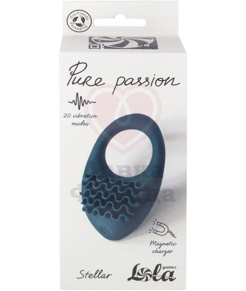 Эрекционное вибро-кольцо Lola Games Pure Passion Stellar имеет 20 вибро-режимов, которые доставят наслаждение или вам или вашей партнерше - для этого фактурная виброчасть располагается на мошонке или на клиторе. Перезаряжается через магнитный USB кабель. Аксессуар полностью защищен от влаги, поэтому его можно использовать в ванне или душе, но не рекомендуется держать устройство в воде дольше получаса, или опускать на глубину более 1 метра. Нежный силикон совместим с лубрикантами только на водной основе. Мыть обычной водой и мылом или обрабатывать специальным спреем для игрушек.