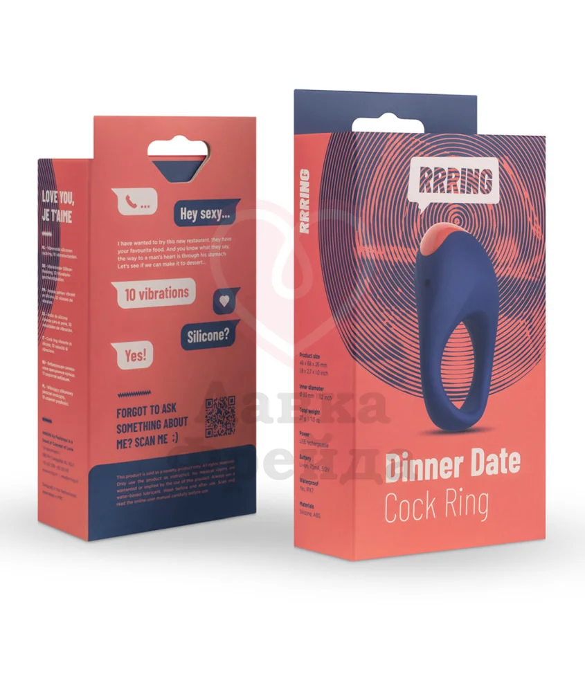 Эрекционное кольцо Rrring Dinner Date Cock Ring имеет 10 вибро-режимов разной интенсивности. Во время соло-игры можно повернуть девайс язычком вниз, стимулируя мошонку. А в паре с женщиной - повернуть язычок вверх, лаская ее клитор. Перезаряжается через USB кабель. Выполнено из бархатистого, нежного на ощупь материала, совместимого с лубрикантами на водной основе. Чистить спреем для игрушек или водой с мылом.