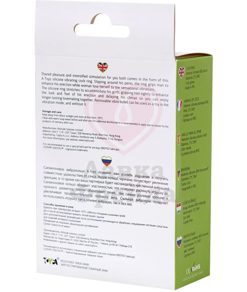 Эрекционное кольцо A-Toys by Toyfa Flik выполнено из эластичного силикона - шелковистый, хорошо тянущийся материал, который обеспечивает плотную комфортную посадку на основании ствола, оттягивая эякуляцию и продлевая время близости. В комплект входит съёмная вибропуля с 1 режимом вибрации, которую можно расположить под членом, усиливая собственные ощущения, или расположить её сверху, стимулируя клитор партнёрши. Вибропуля работает от двух батареек типа L736F. Для большего комфорта и лучшего скольжения возьмите лубрикант на водной основе. Для очистки используйте специализированное антибактериальное средство для игрушек.