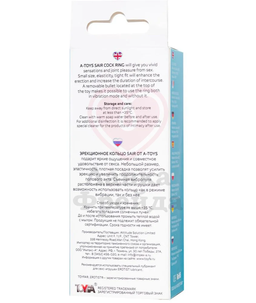 Эрекционное кольцо A-Toys by Toyfa Sair - компактный аксессуар для усиления ощущений в паре. Изделие дополнено съёмной вибропулей в верхней части и маленькими подвижными отростками по окружности кольца, которые будут дополнительно воздействовать на внешние эрогенные зоны во время проникновения.