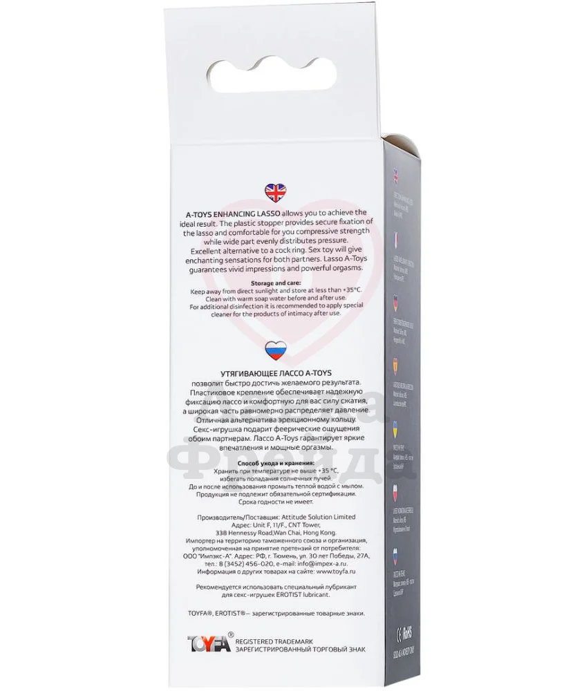 Выполнен из мягкого медицинского силикона с пластиковым креплением, которое позволяет надёжно зафиксировать девайс и отрегулировать силу сжатия с учётом индивидуальных ощущений. Рассчитан на усиление ощущений обоих партнёров: он может разнообразить интимную жизнь и способствовать более яркой сексуальной реакции. Перед и после применения лассо следует очищать тёплой водой с мылом либо специальным антибактериальным средством.