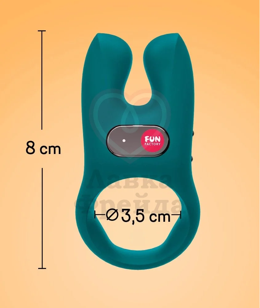 Сверху кольцо оснащено двумя кончиками, между которыми будет очень удобно зажимать головку клитора во время проникающего секса. Вы также можете использовать эти кончики на другие эрогенные зоны в качестве внешнего стимулятора. Всего у Nos 2 мотора с 4 скоростями вибрации и 1 дразнящим режимом "флирт". В качестве эрекционного кольца Fun Factory рекомендует носить игрушку не дольше 20 минут, а затем снимать её, чтобы нормализовать кровообращение (это актуально для всех колечек подобного типа).