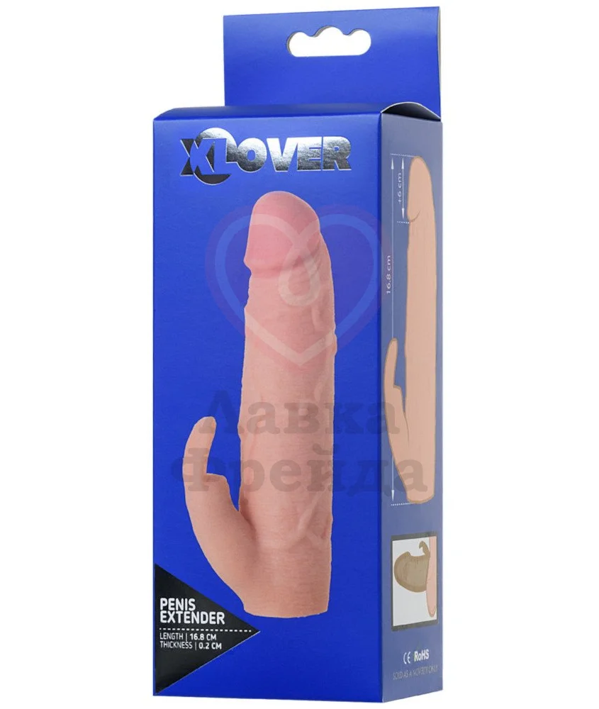 Насадка для увеличения члена выполнена из нежного и безопасного эластомера в реалистичном стиле. Дизайн анатомический — с выраженной головкой, венками и объемным стволом. У основания игрушки находится дополнительный маленький кончик с ушками для клиторальной стимуляции.