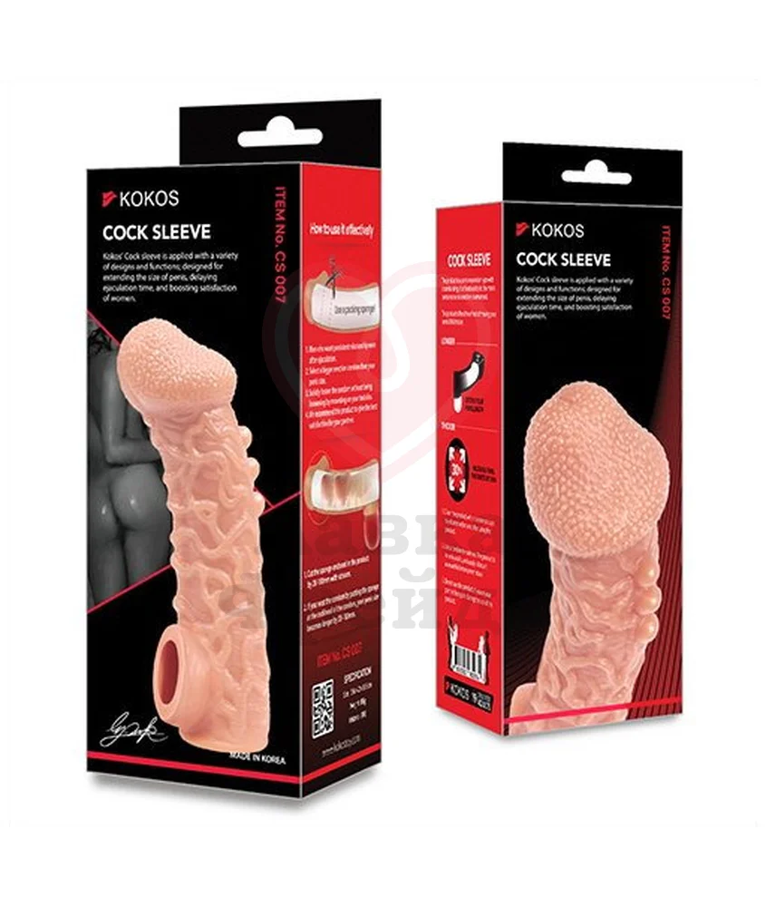 Насадку Kokos Cock Sleeve CS007-M можно использовать для увеличения члена партнёра или секс-игрушки вроде фаллоимитатора. Насадка выполнена в реалистичном дизайне, но с более объёмной рельефной головкой, ярко выраженными венками и бугорками для дополнительных приятных ощущений во время проникновения. Так как насадка полностью закрытая, то чувствительность члена снизится, повысив продолжительность секса.