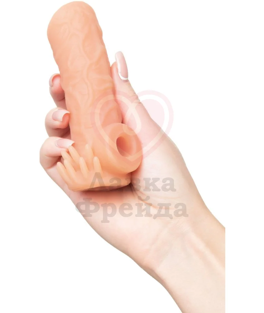 В этой версии насадки есть также отверстие для мошонки, что обеспечит ещё более надёжное закрепление, а также дополнительную стимуляцию для мужчины. Эластичный плотный материал выдержит любую эрекцию, а также доставит приятные ощущения своей нежной, бархатистой текстурой, напоминающей на ощупь настоящую кожу.