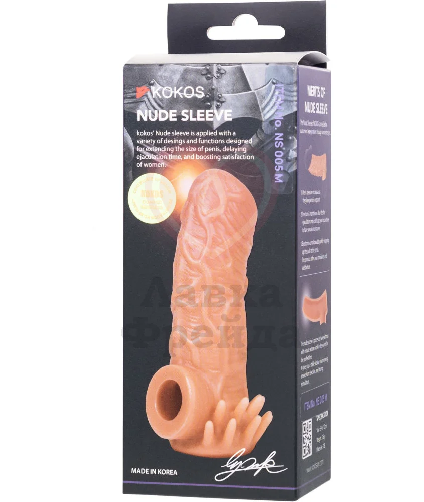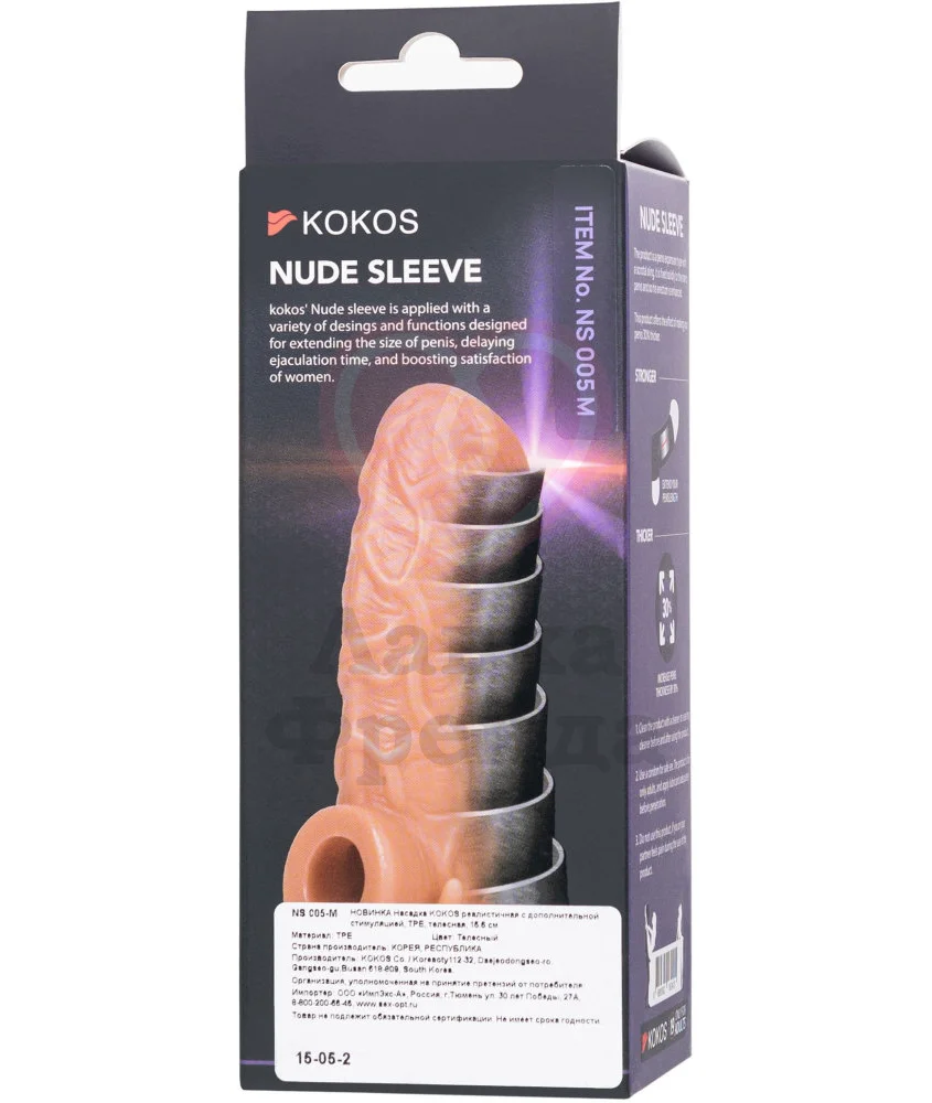 Насадка Kokos Nude Sleeve NS005-M оставляет открытой головку, не снижая тем самым чувствительность. Классическая форма с набухшими венками увеличит диаметр, а усики в основании будут стимулировать клитор партнерши, добавляя эффект новизны в интимную жизнь.
