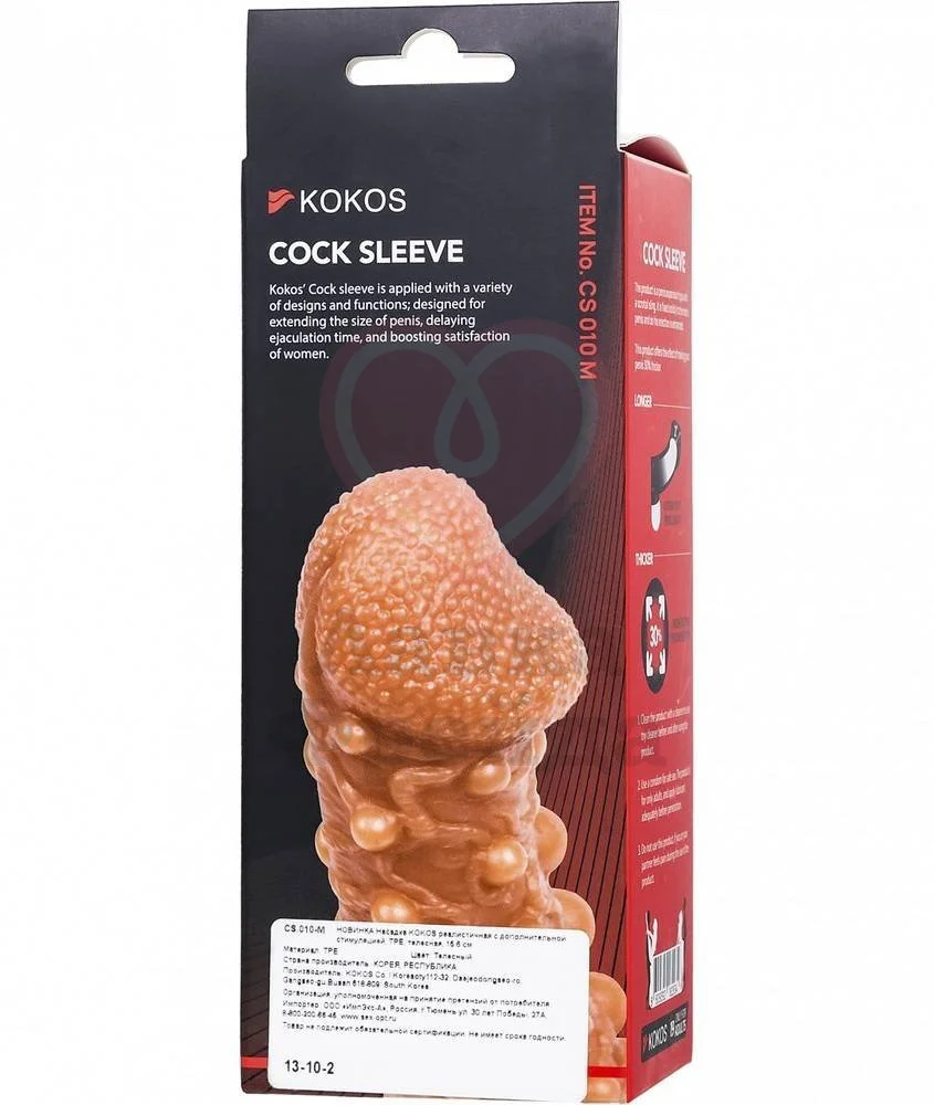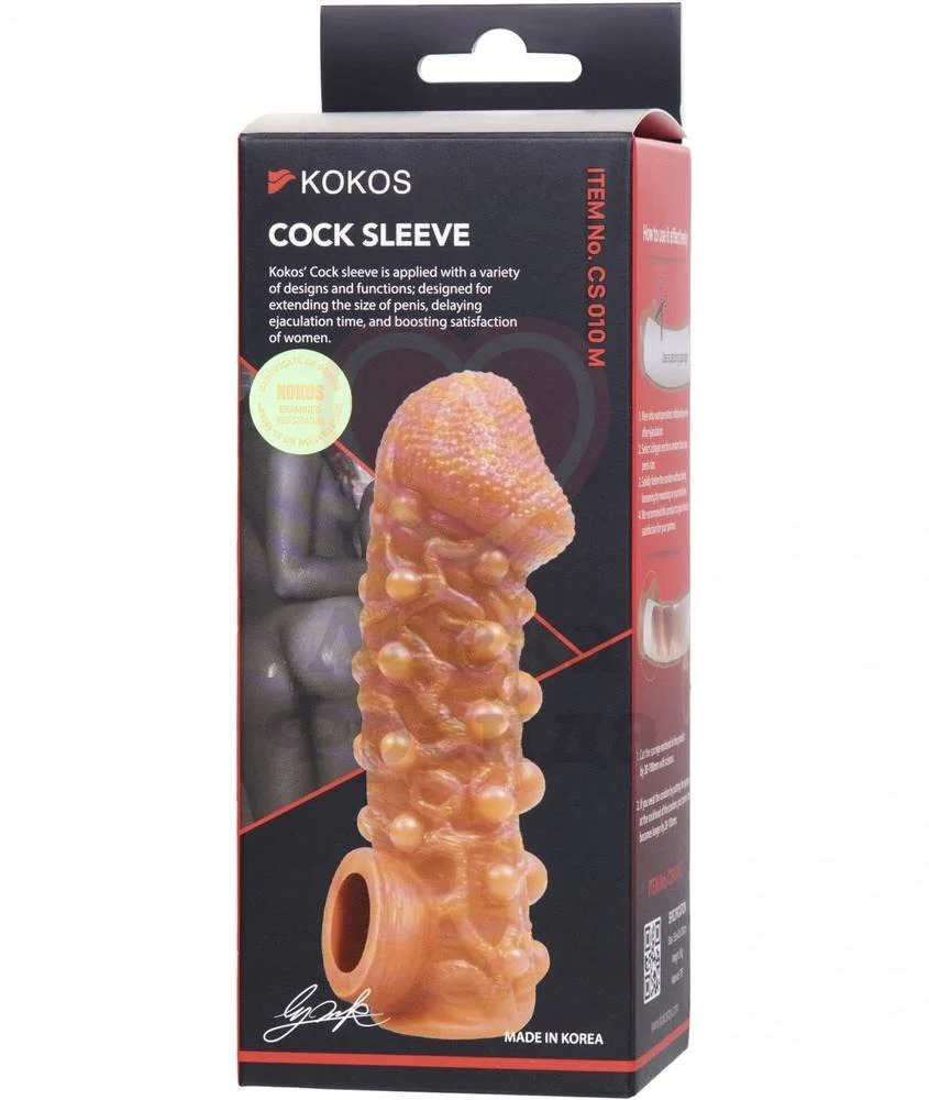 Насадку Kokos Cock Sleeve CS010-M можно использовать для увеличения члена партнёра или секс-игрушки вроде фаллоимитатора. Насадка выполнена в реалистичном дизайне, но с более объёмной рельефной головкой, ярко выраженными венками и бугорками для дополнительных приятных ощущений во время проникновения. Так как насадка полностью закрытая, то чувствительность члена снизится, повысив продолжительность секса.