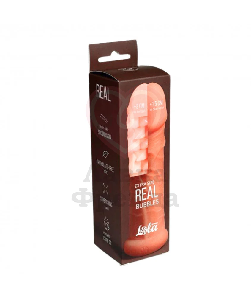 Насадка Real Extra Size Bubbles удлинит ствол на 3 сантиметра, а его диаметр увеличится на 1,5 см. Изделие крепится под мошонкой с помощью мягкого эластичного кольца. Удлинитель выполнен из термопластичного эластомера, который внешне и на ощупь похож на настоящую кожу - такой же упругий и тактильно приятный.