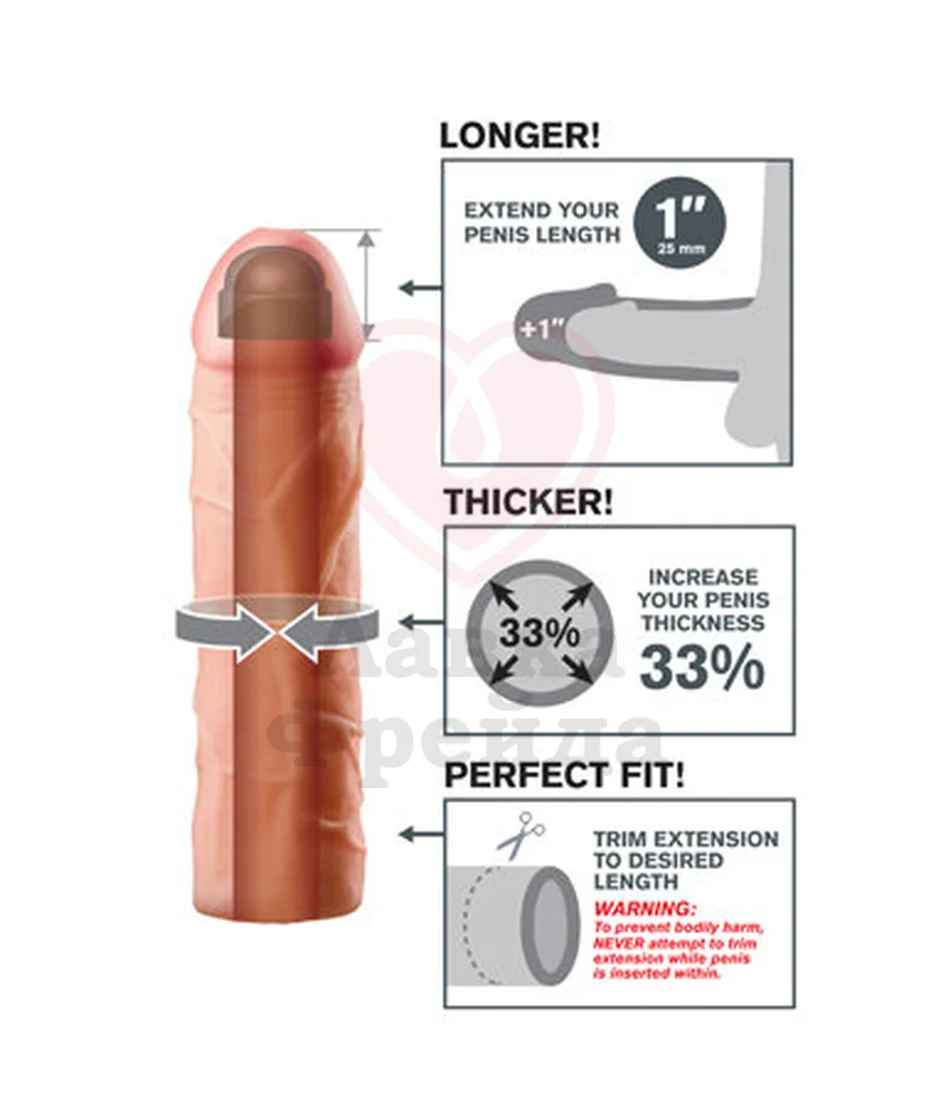 Насадка удлинитель Perfect 1'' Extension - супер эластичная, мягкая и ультра - реалистичная. Находка для любого мужчины, чтобы удивить свою вторую половинку и подарить новые ощущения: более глубокое и полное проникновение. Ощущается, как вторая кожа доставляя удовольствие обоим партнёрам. Легко обрезается у основания для идеальной подгонки размера. Используется на вибраторы и фаллоимитаторы. Удлиняет на 25 мм, увеличивает диаметр мужского достоинства на 33 %. Цвет: Телесный. Размер: длина - 17,7 см, диаметр - 4,4 см; внутренний минимальный диаметр - 2,5 см. Материал: TPE-Elastomer.