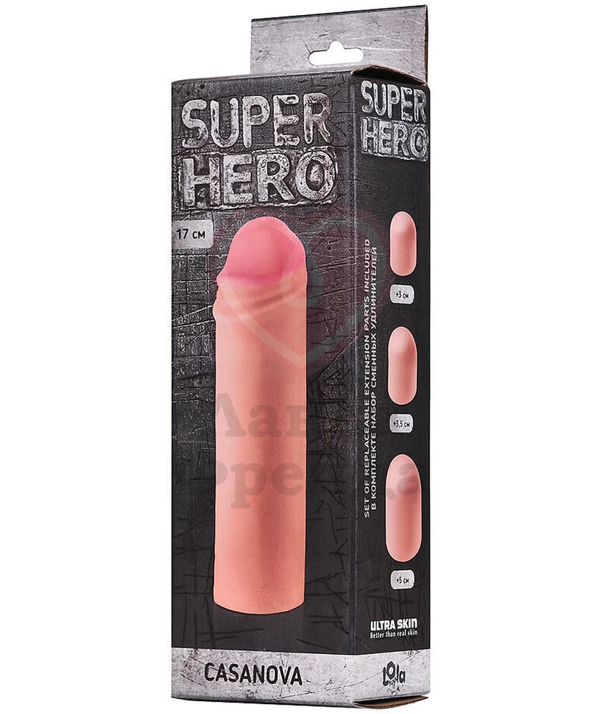Насадка Lola Games Super Hero Casanova — безоперационное решение для увеличения мужского ствола. Три сменных удлинителя в комплекте (3 см, 3,5 см и 5 см) дают возможность регулировать глубину проникновения. Плотный обхват и увеличение диаметра до 2 см обеспечиваются за счёт эластичного материала Neoskin, представленного в естественном телесном оттенке — он будет облегать фаллос подобно второй коже, обеспечивая идеальную посадку. Фактурная головка со складками создаёт дополнительную стимуляцию, помогая продлить половой акт. Общая длина - 17 см. Для использования подходят исключительно смазки на водной основе.