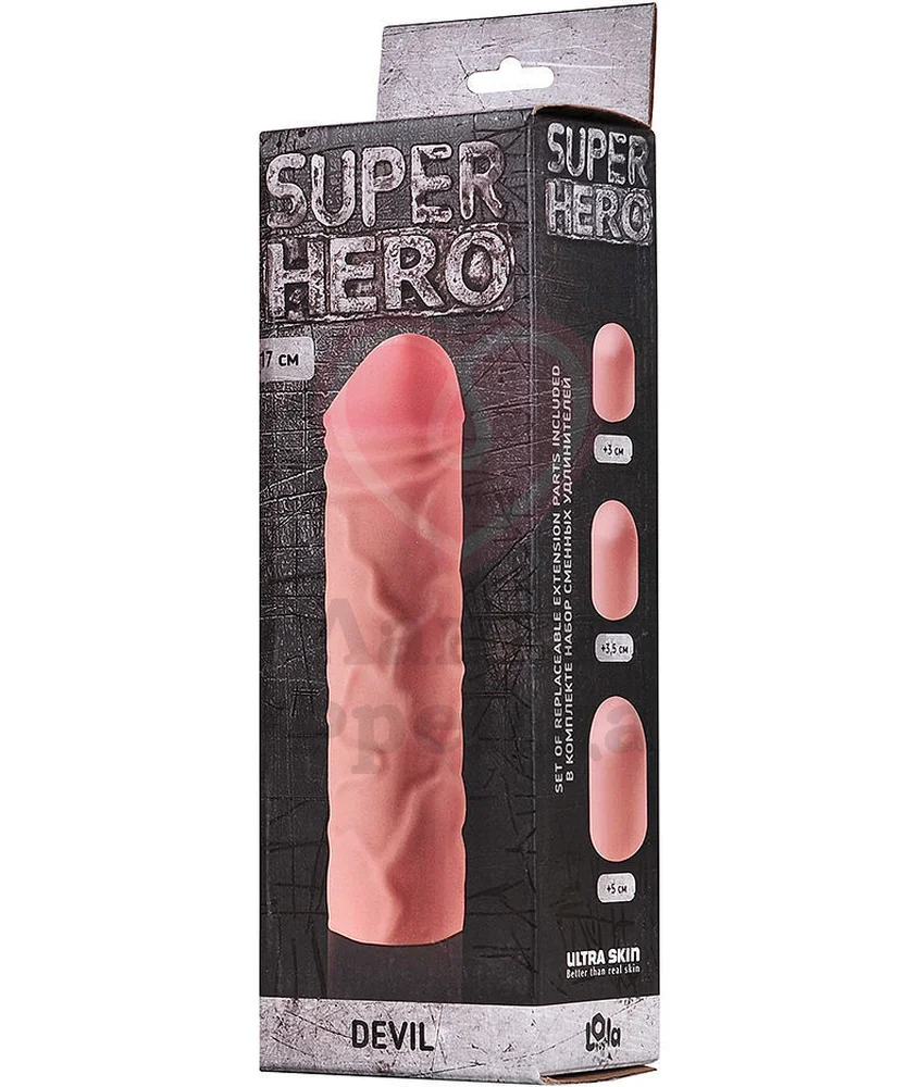 Безоперационное увеличение длины и диаметра мужского ствола достигается с помощью насадки Lola Games Super Hero Devil. Комплект поставки предусматривает три удлинителя (3 см, 3,5 см и 5 см), позволяющих настраивать комфортную глубину проникновения по своему усмотрению. Материал Neoskin, представленный в естественном телесном оттенке, отличается высокой эластичностью, плотно облегает и увеличивает диаметр до 2 см. Реалистичная фактурная головка со складками повышает уровень стимуляции, что может продлить половой акт. Общая длина - 17 см. Насадка совместима только со смазками на водной основе.