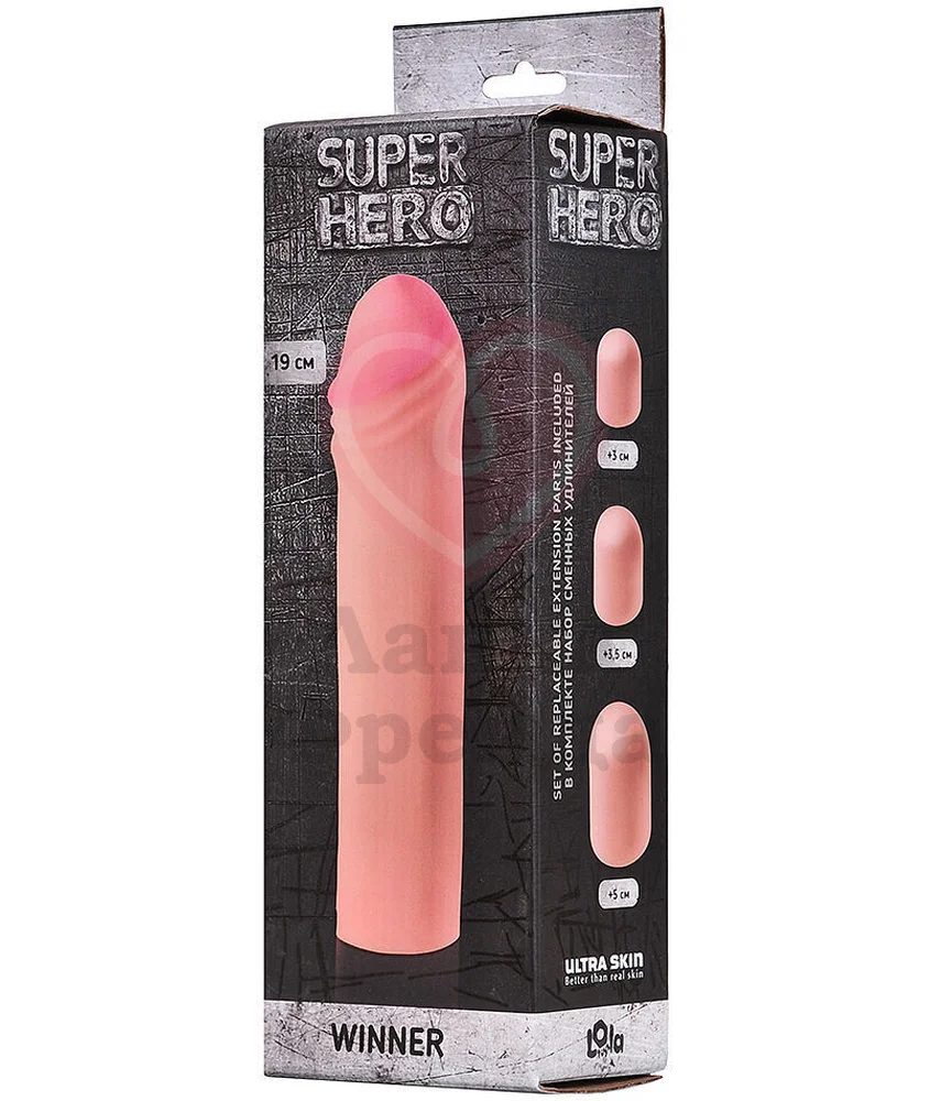 Насадка Lola Games Super Hero Winner даёт возможность безоперационно сделать мужской ствол длиннее и толще. Комплект включает в себя три сменных удлинителя длиной 3 см, 3,5 см и 5 см — с ними пользователь может регулировать глубину проникновения. Изделие увеличивает диаметр до 2 см, обеспечивает плотный обхват за счёт хорошо тянущегося материала Neoskin телесного цвета, который прилегает как вторая кожа. Фактурная головка с естественными складками усиливает стимуляцию и способствует продлению полового акта. Общая длина - 19 см. Использовать насадку допустимо исключительно с лубрикантами на водной основе.