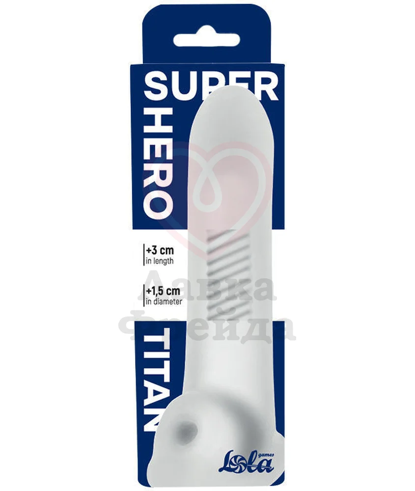 Lola Games Super Hero Titan White - безболезненный и эффективный способ сделать член длиннее на 3 см и толще на 1,5 см, не прибегая к помощи хирургов. Насадка сделана из белого термопластичного эластомера, который плотно прилегает к стволу, обеспечивая эффект второй кожи. Фактурная внутренняя поверхность дополнительно стимулирует фаллос во время интимной близости, а фиксирующее кольцо, размещаемое под яичками, продлевает половой акт, выступая в роли эрекционного кольца. Общая длина аксессуара - 16,5 см. Материал насадки совместим со смазками только на водной основе - гель необходимо нанести внутрь, перед тем, как надеть устройство, и сверху перед проникновением.