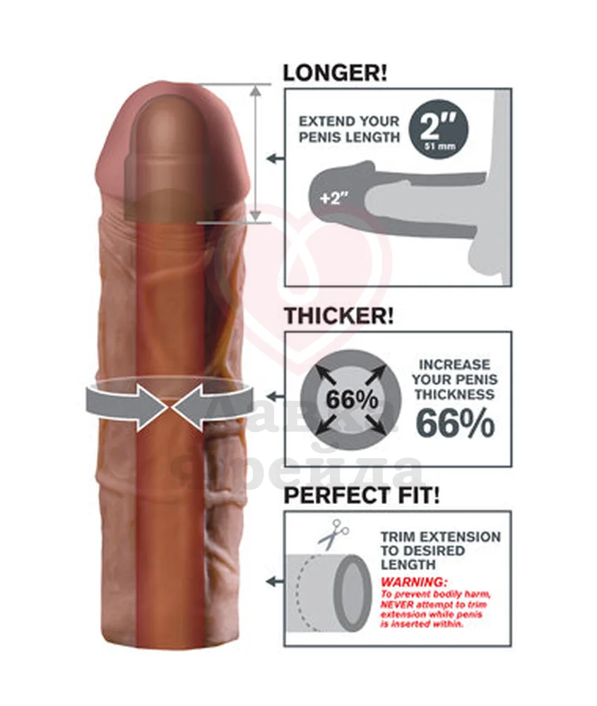 Насадка удлинитель Mega 2'' Extension - супер эластичная, мягкая и ультра - реалистичная. Находка для любого мужчины, чтобы удивить свою вторую половинку и подарить новые ощущения: более глубокое и полное проникновение. Ощущается, как вторая кожа доставляя удовольствие обоим партнёрам. Легко обрезается у основания для идеальной подгонки размера. Используется на вибраторы и фаллоимитаторы. Удлиняет на 51 мм, увеличивает диаметр мужского достоинства на 66 %. Цвет: Коричневый. Размер: длина - 20,3 см, диаметр - 5 см; внутренний минимальный диаметр - 3,2 см. Материал: TPE-Elastomer.