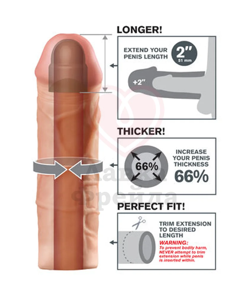 Насадка удлинитель Mega 2'' Extension - супер эластичная, мягкая и ультра - реалистичная. Находка для любого мужчины, чтобы удивить свою вторую половинку и подарить новые ощущения: более глубокое и полное проникновение. Ощущается, как вторая кожа доставляя удовольствие обоим партнёрам. Легко обрезается у основания для идеальной подгонки размера. Используется на вибраторы и фаллоимитаторы. Удлиняет на 51 мм, увеличивает диаметр мужского достоинства на 66 %. Цвет: Телесный. Размер: длина - 20,3 см, диаметр - 5 см; внутренний минимальный диаметр - 3,2 см. Материал: TPE-Elastomer.