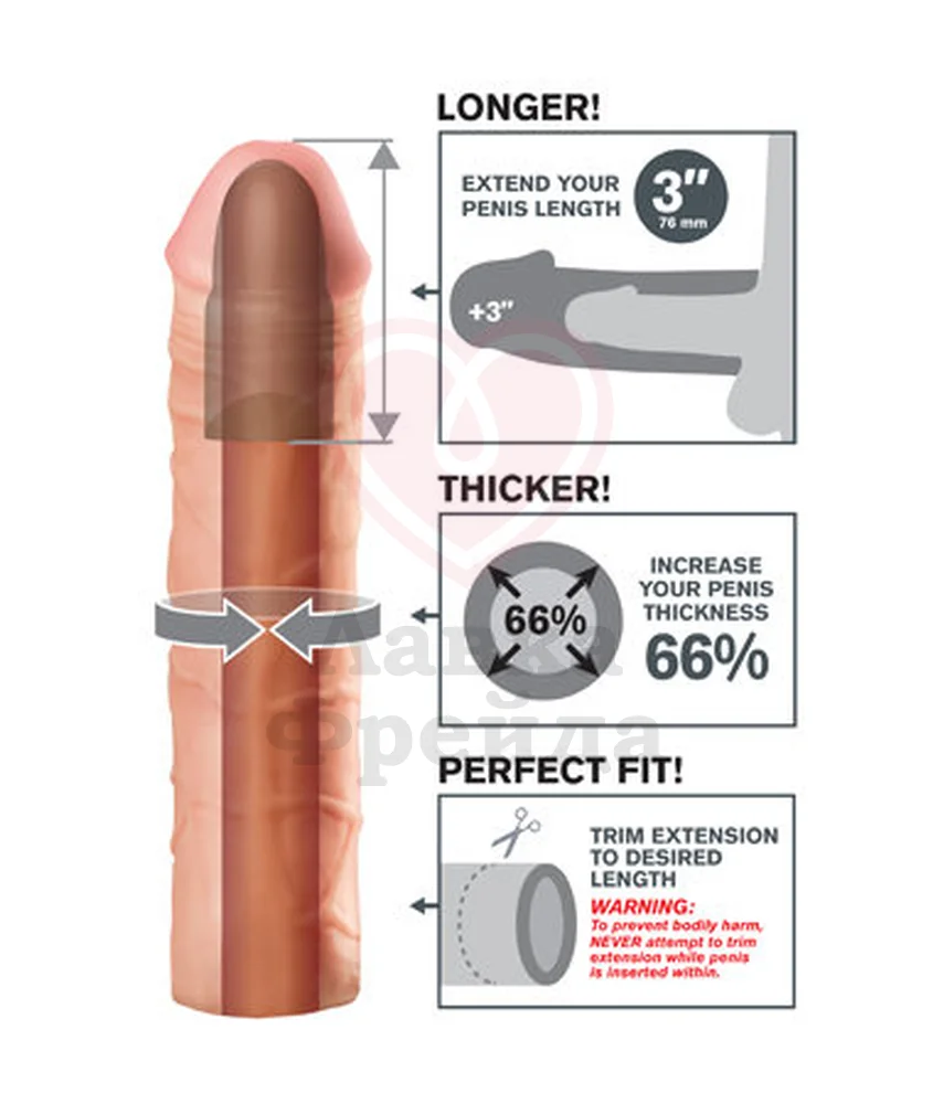 Игрушку можно подрезать до необходимой длины, добиваясь точной подгонки по размеру. Надевать удлинитель можно не только на член, но и на игрушки - вибраторы и фаллоимитаторы, увеличивая их на 66%. Очищать можно теплой водой с мылом или специальными антибактериальными средствами для игрушек. Для увлажнения во время проникновения используйте лубриканты на водной основе.