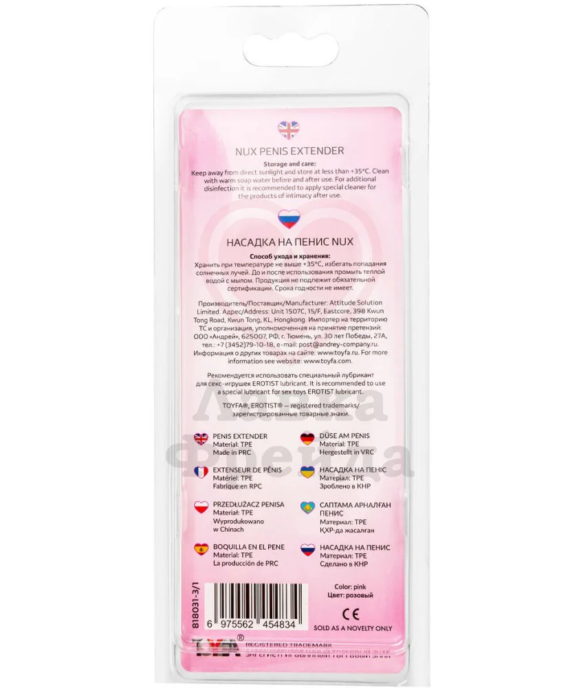 Приятный на ощупь материал изделия (термопластичный эластомер) хорошо тянется, обеспечивая комфортную посадку и не соскальзывая во время близости. Для большего удобства нанесите внутрь и снаружи немного смазки на водной основе. Очищайте тёплой водой с мягким мылом, а затем обработайте специализированным антибактериальным средством.