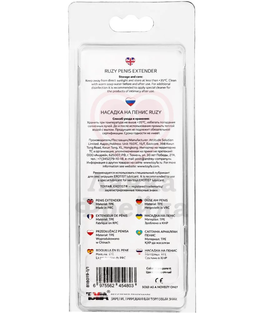 A-Toys by Toyfa Ruzy - прозрачная насадка на член, с помощью которой ствол можно сделать длиннее и толще. Внешняя часть изделия имеет объёмную головку, ряд массажных шипов и специальный отросток, предназначенный для точечной стимуляции клитора партнёрши во время проникновения.