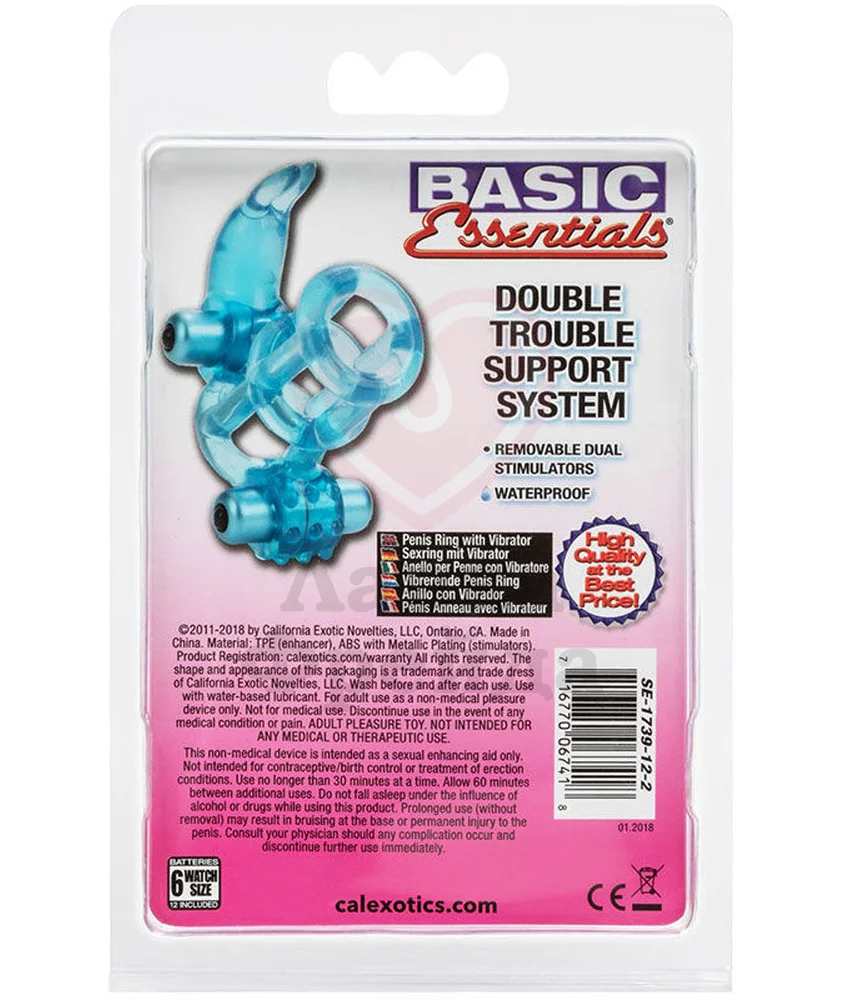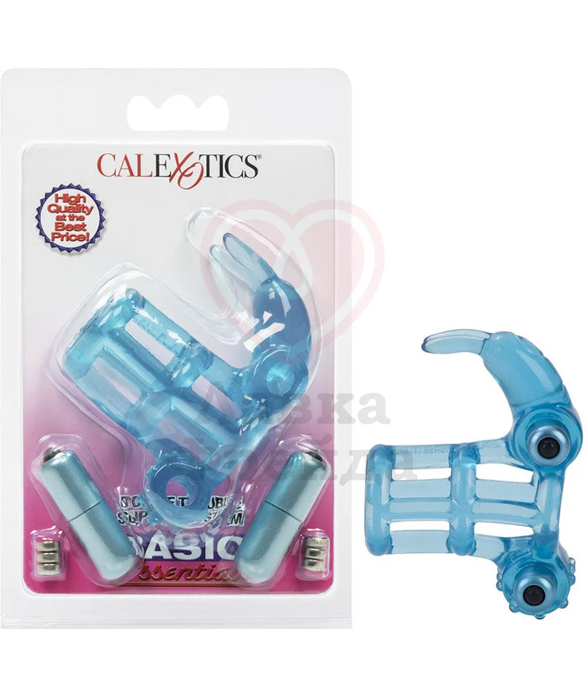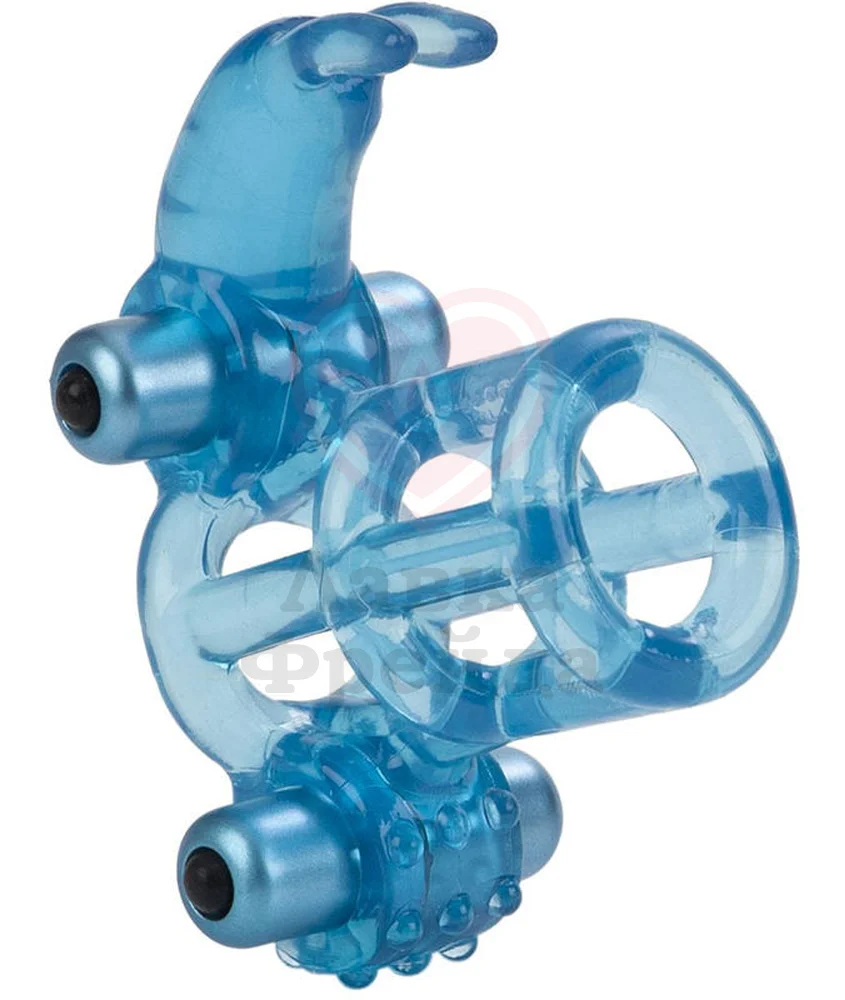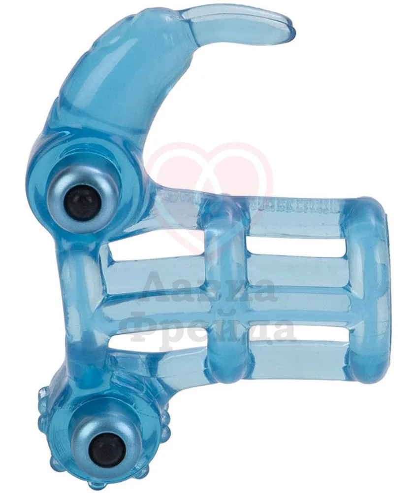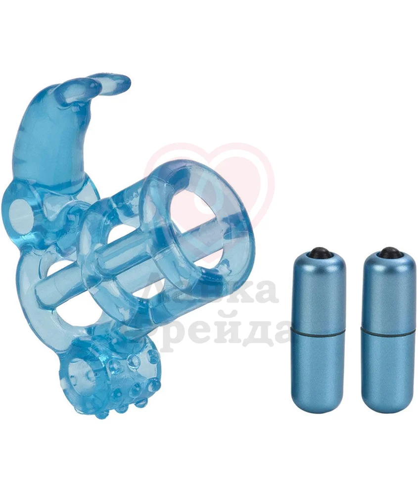 Эластичная насадка помогает продлить состояние эрекции полового члена, один виброэлемент предназначен для стимуляции мошонки, а второй для массажа клитора с помощью ушек кролика. Размер 6,3 х 7,5 см.
