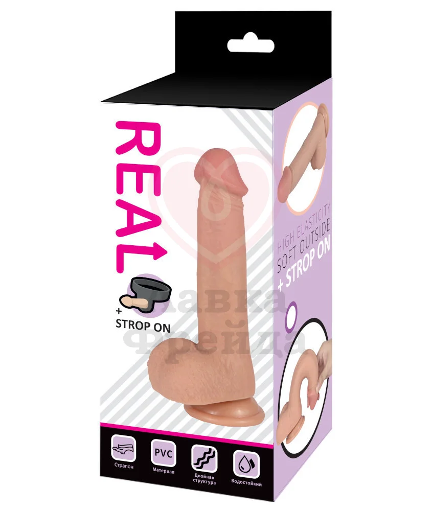 В этом небольшом наборе Real находятся трусики для страпона на ремешках и реалистичная насадка с присоской, которую также можно использовать отдельно в качестве фаллоимитатора. Основная часть игрушки выполнена из гибкого двухслойного ПВХ — с плотным стержнем и мягкой поверхностью, которую можно совмещать с лубрикантами на любой основе. Реалистичный дизайн фаллоимитатора обладает выраженной головкой, легким рельефом и мошонкой для дополнительной стимуляции.