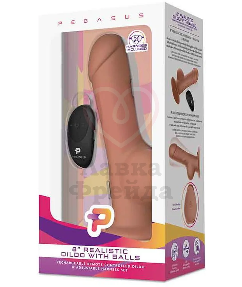Страпон Pegasus имеет реалистичную насадку длиной 21 см и диаметром 4 см. На его основании находится присоска, а закрепляется он на специальные трусики под колечко. Трусики выполнены из нейлона, с мягкой основной частью, кармашком для пульта управления и регулируемыми ремешками, которые можно настроить для обхвата талии до 170 см. В комплект включены три колечка диаметром 3 см, 4,5 см и 5 см, чтобы вы смогли использовать трусики и с другими вашими игрушками на присоске.