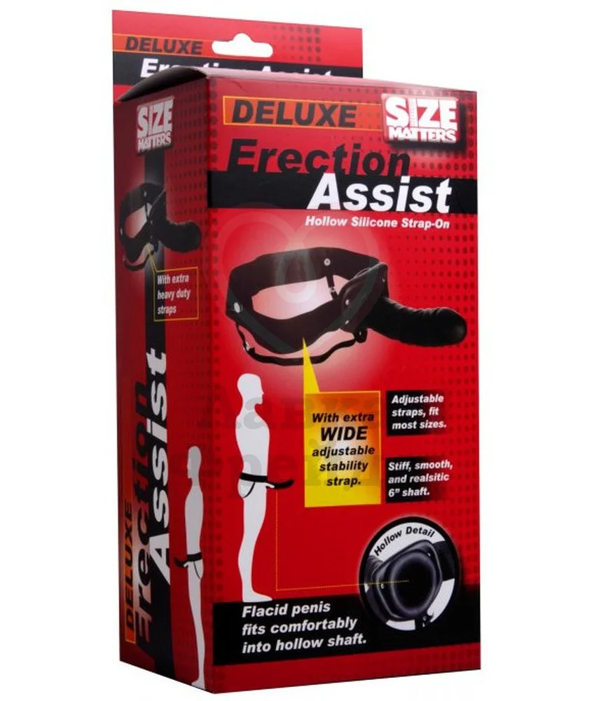 Фаллопротез Deluxe Size Matter Erection Assist поможет вам доставить ещё больше удовольствия вашему партнёру. Размер, объём и анатомическая форма этого полого фаллоимитатора передают вполне естественные ощущения — но больше, сильнее и дольше. Длина фаллопротеза 15 см, а максимальный диаметр 4 см.