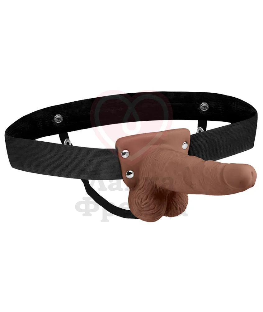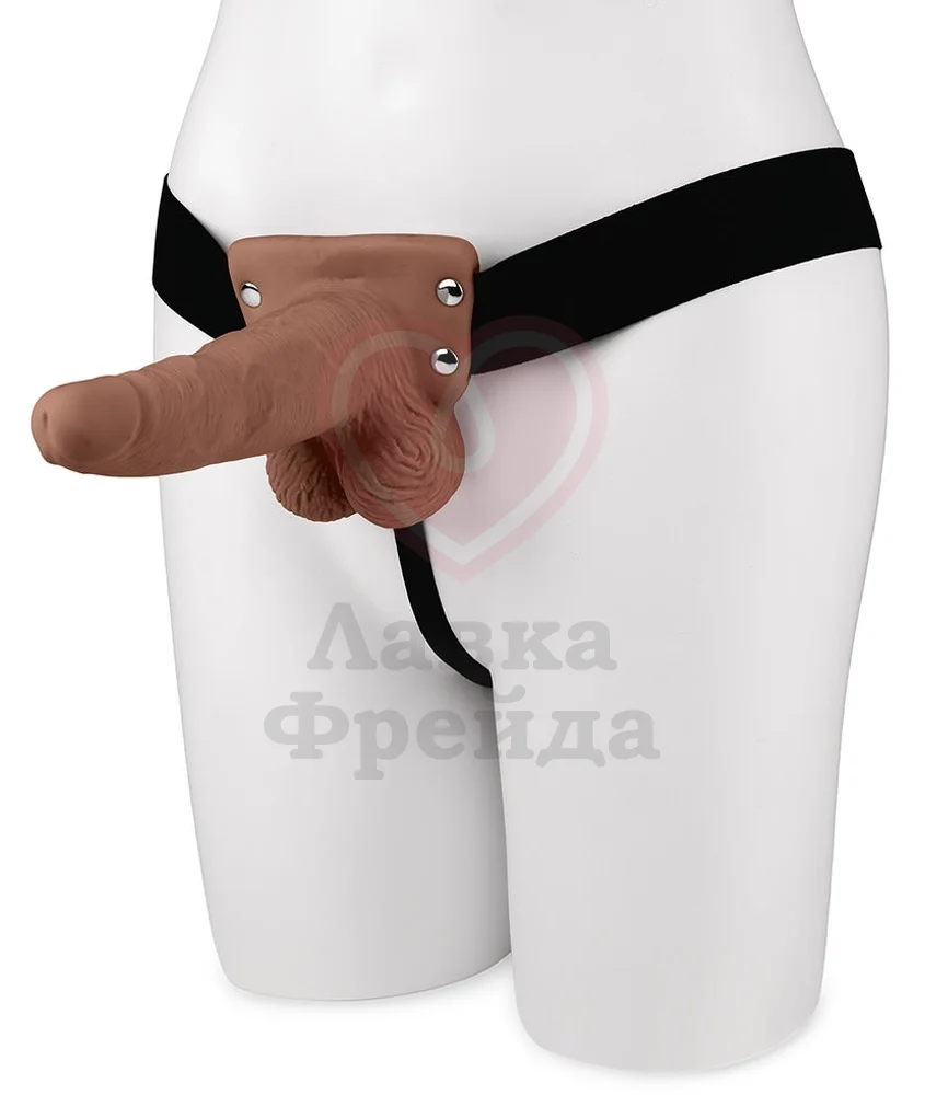 Внутри вибратора находится полость, чтобы страпон можно было использовать любому из партнеров. На выбор предоставлено 7 режимов для разнообразной сильной стимуляции, кнопки управления вибрацией находятся снизу мошонки. Эластичный пояс подходит для талии обхватом до 165 см.