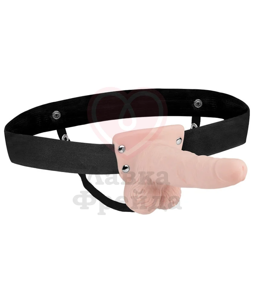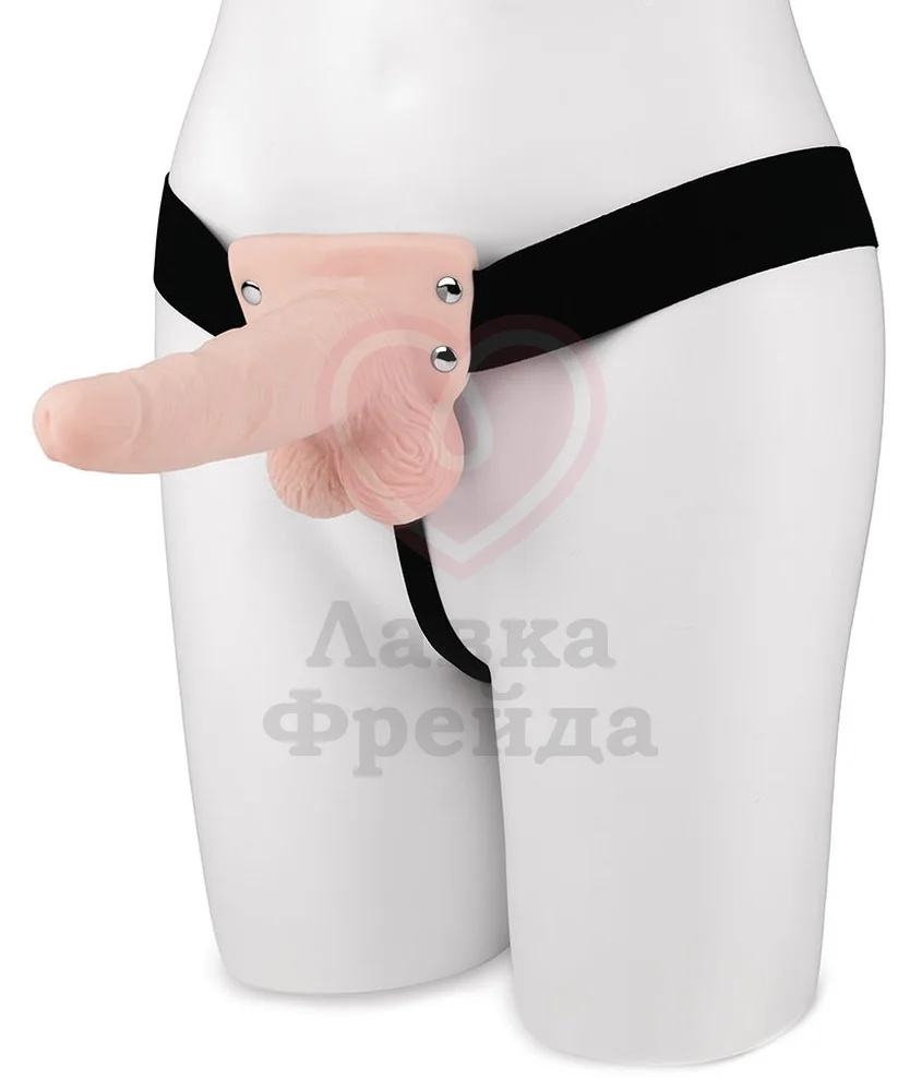 Внутри вибратора находится полость, чтобы страпон можно было использовать любому из партнеров. На выбор предоставлено 7 режимов для разнообразной сильной стимуляции, кнопки управления вибрацией находятся снизу мошонки. Эластичный пояс подходит для талии обхватом до 165 см.