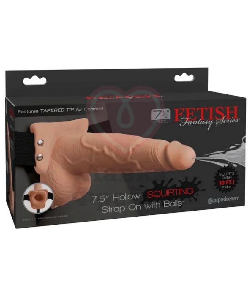 С полым страпоном Fetish Fantasy Hollow Squirting Strap-On with Balls Flesh вы сможете подарить партнерше огразм с семяизвержением. Для достижения эффекта эякуляции необходимо сжать член около головки, погрузить её в жидкость, а затем отпустить фаллос, чтобы жидкость всосалась внутрь игрушки. После этого в любой момент можно сжать ствол, чтобы оттуда брызнула струя, которая может достигать в длину более 3 метров.
