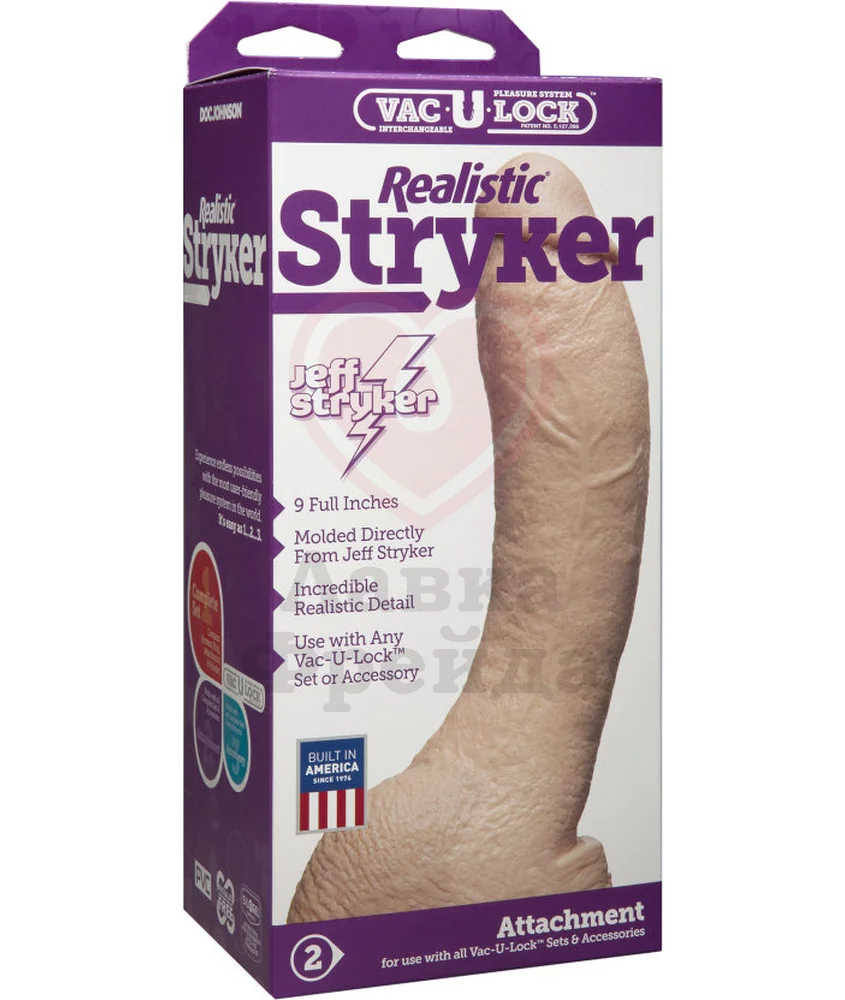 Realistic Stryker – это большая фаллоимитатор-насадка немного изогнутой формы с выпуклой головкой, венками и мошонкой. Длина проникновения игрушки – 19 см, максимальный диаметр – 5,7 см. Надёжно крепится к трусикам страпона с креплением Vac-U-Lock. Вы можете наслаждаться насадкой в качестве самостоятельной игрушки. Мошонка играет роль ограничителя, обеспечивая безопасное анальное проникновение.