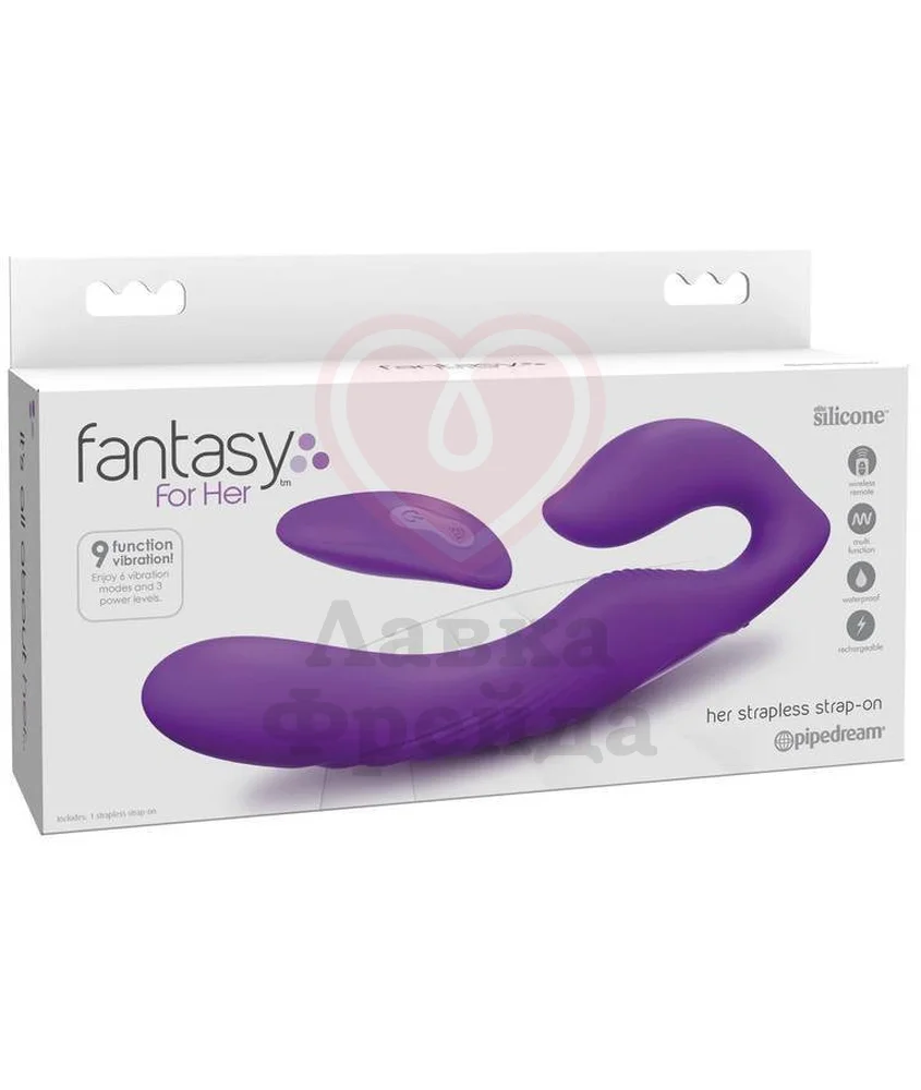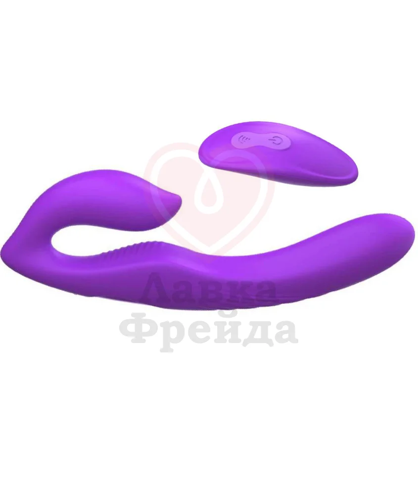 С безремневым страпоном Fantasy For Her Her Ultimate Strapless Strap-On вам не понадобятся трусики и крепления. Короткий отросток вводится в вагину, где удерживается на месте мышцами тазового дна, а длинный ствол проникает в партнера. 9 вибро-режимов равномерно распределяются по обоим отросткам, а саму вибрацию можно активировать либо кнопкой непосредственно на страпоне, либо пультом ДУ.