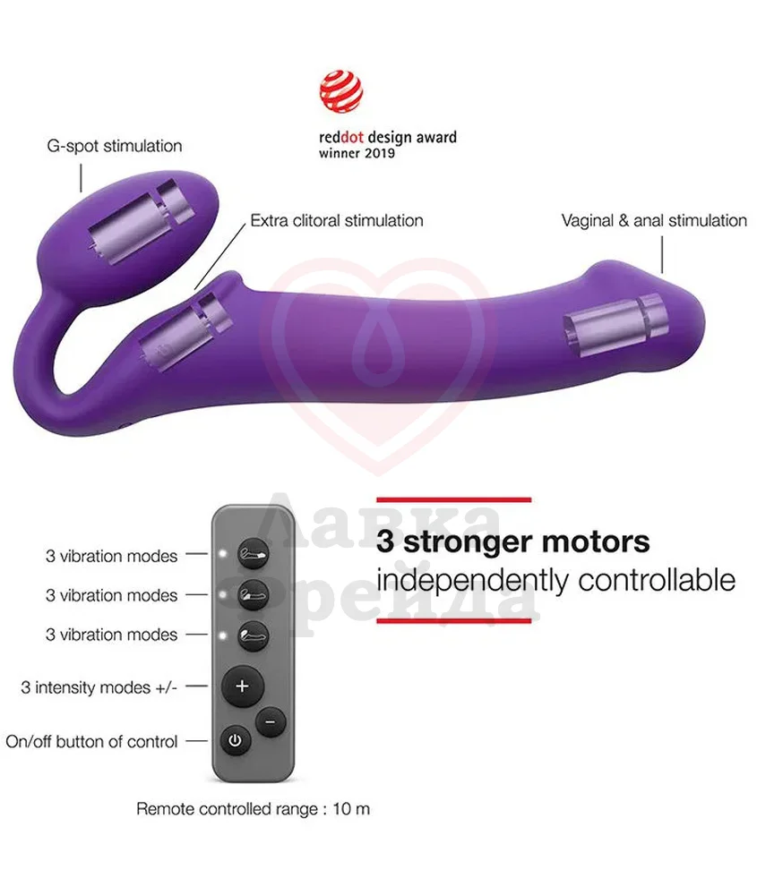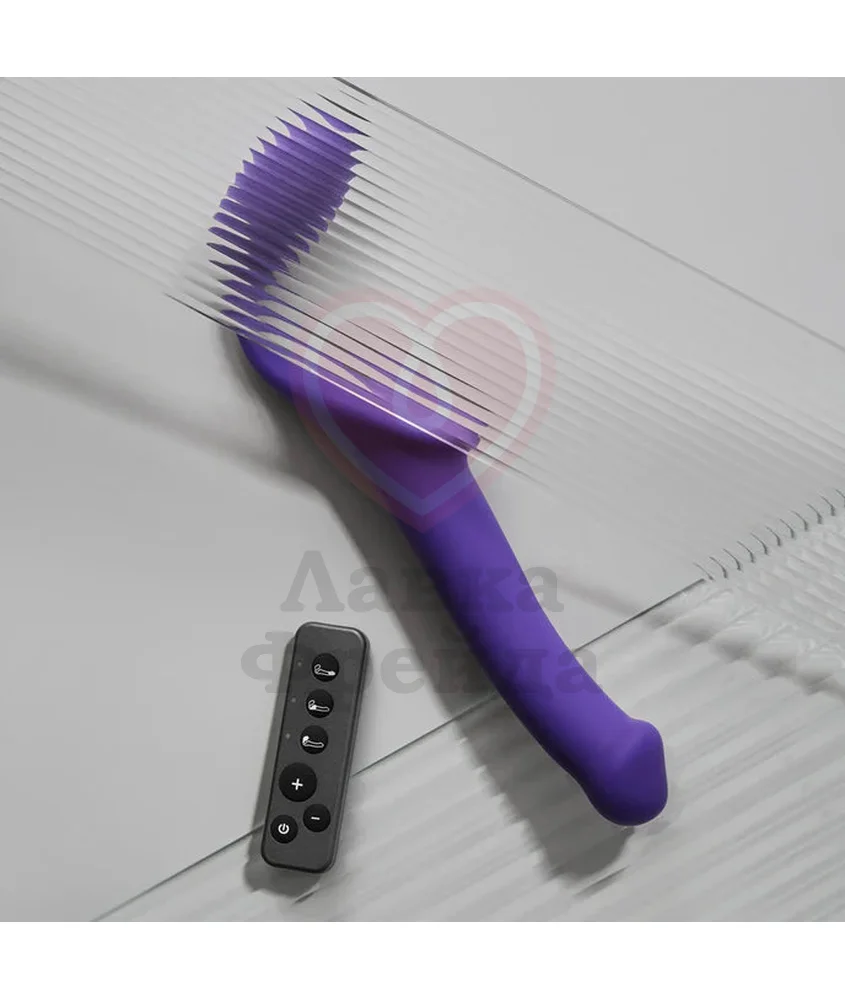 Когда вы совершаете движение — сгиб также двигается вместе с вами, привнося максимум реалистичности. Дистанционный пульт позволяет управлять игрушкой на расстоянии до 10 метров. Им можно выбирать из 3 ритмов и 3 скоростей для каждого моторчика в отдельности. Удобные индикаторы подскажут, какая именно часть страпона сейчас активна для изменения.