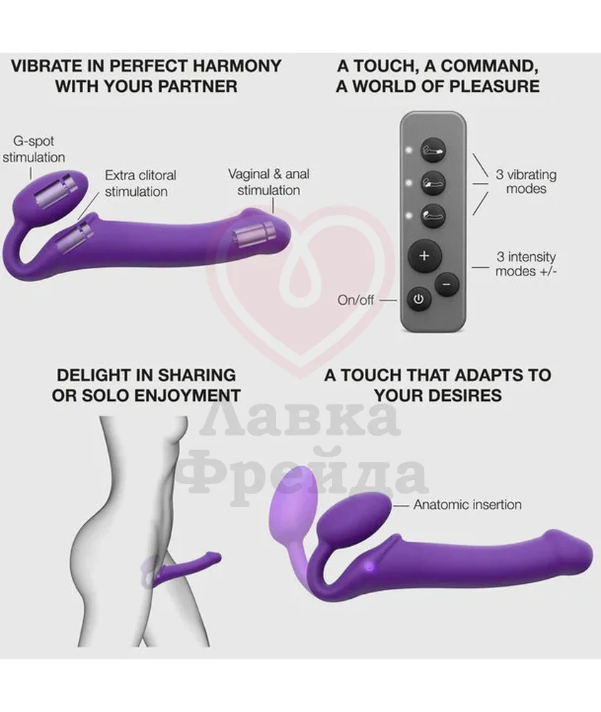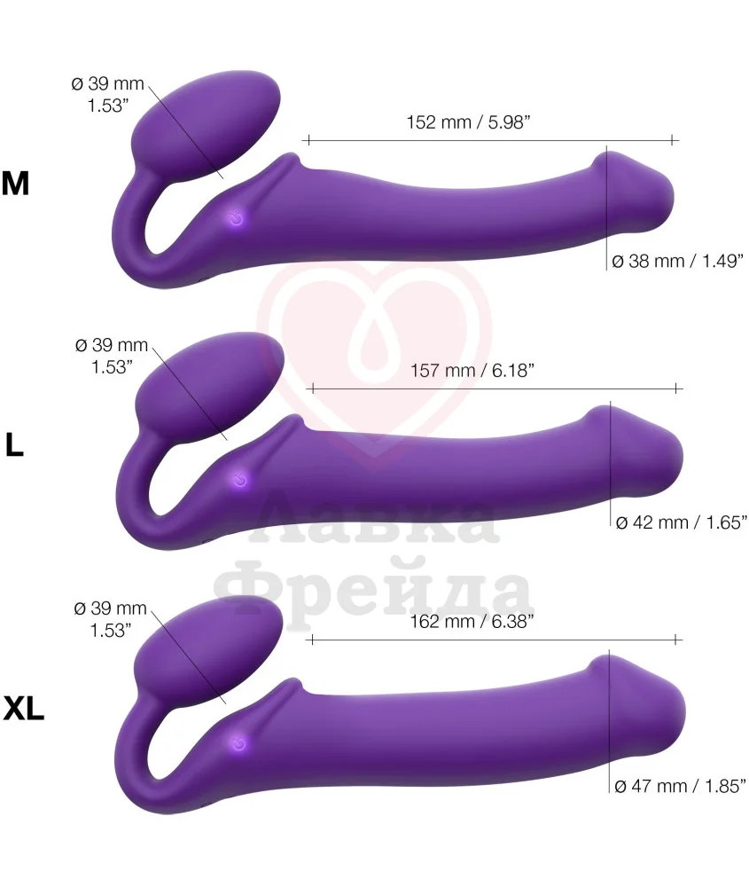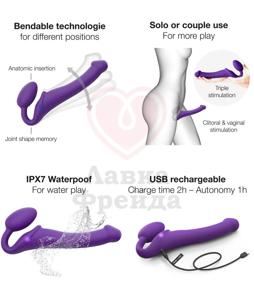 Серия Vibrating Bendable Strap-on-me — это коллекция прекрасных эргономичных безремневых страпонов, которые имеют место для сгиба и целых 3 мотора для вибрации. Удобная и практичная игрушка, которая подстраивается под ваши желания. Каждый из моторов находится в самом нужном месте: