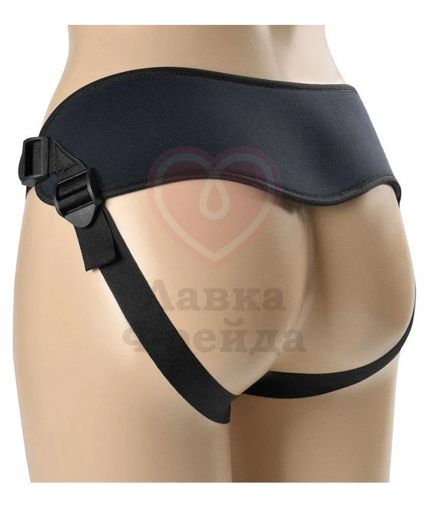 Трусики выполнены из мягкого неопрена, имеют широкий пояс и нейлоновые ремешки для комфортной посадки. На передней части трусиков расположена вставка из натуральной кожи. Размер регулируется при помощи пластиковых пряжек. Трусики максимально удобно ощущаются во время использования, обеспечивая надежное размещение насадок. При необходимости штырьки-коннекторы можно снять с основания трусиков.