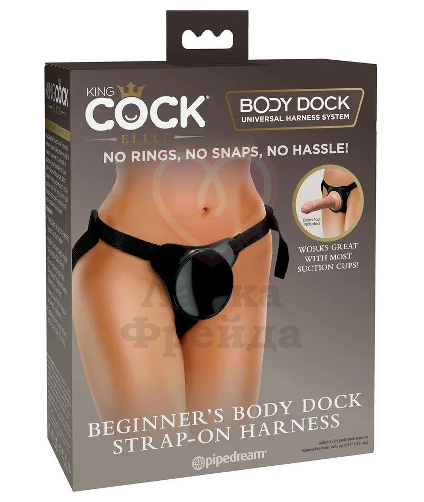 Трусики для страпона Body Dock Strap-On Harness созданы по новой технологии: здесь нет привычных креплений или колечек, только плоская база. Диаметр крепления 8,6 см, что позволяет использовать практически любую насадку с присоской на основании. База с насадкой закрепляется на привычных ремешках-трусиках и регулируется на талии в обхвате до 137 см.