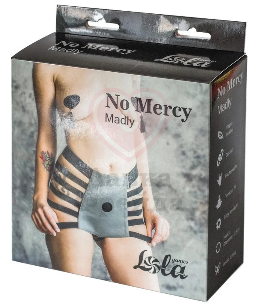 Действительно нетривиальная модель трусиков для страпона No Mercy Madly имеет не только необычный вид, но и довольно удобную конструкцию. Несколько эластичных ремешков поддерживают вставку из искусственной серой кожи, к которой через специальное отверстие диаметром 3,5 см крепится любая игрушка с присоской, которая приобретается отдельно и в комплекте не идёт.