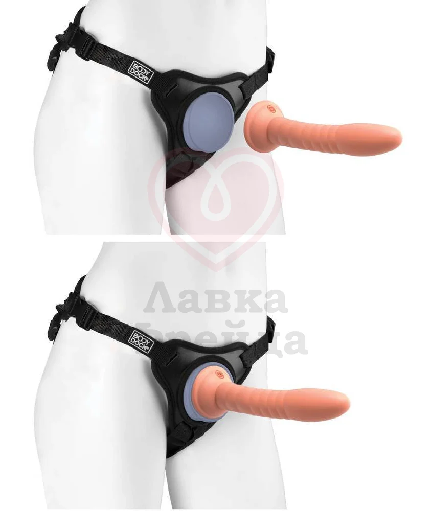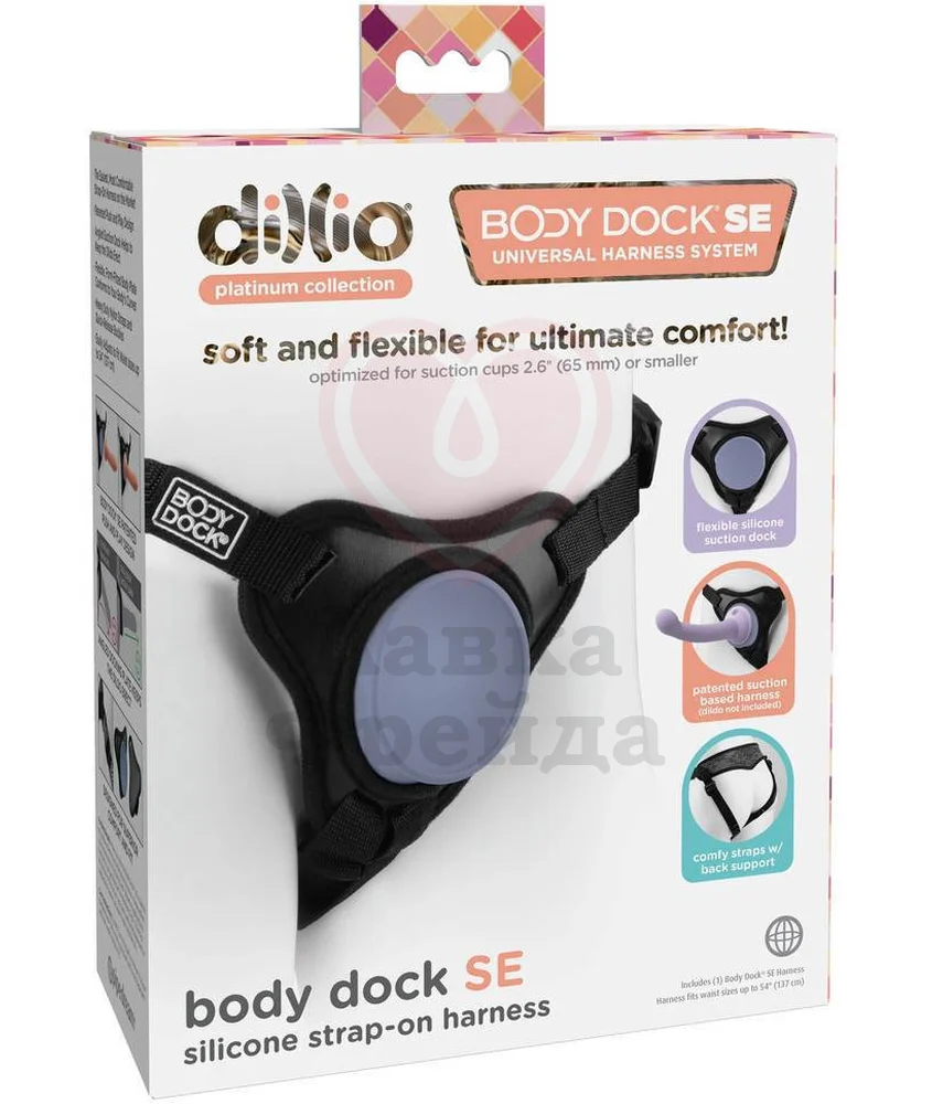 Трусики Body Dock SE имеют гибкую силиконовую основу для вибраторов и фаллоимитаторов на присоске, систему прочных ремней из нейлона, мягкую спинку и пряжки по бокам, которые обеспечивают идеальную посадку по фигуре. Наклонная платформа для фаллоса не дает ему провисать, что создает более реалистичные и естественные ощущения. Чтобы закрепить игрушку на пластине, необходимо прижать присоску вибратора к вогнутой плите, пока не выйдет весь воздух из зазора между ними.