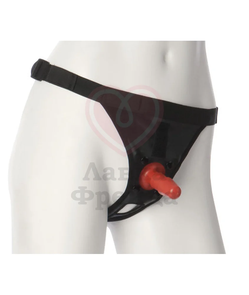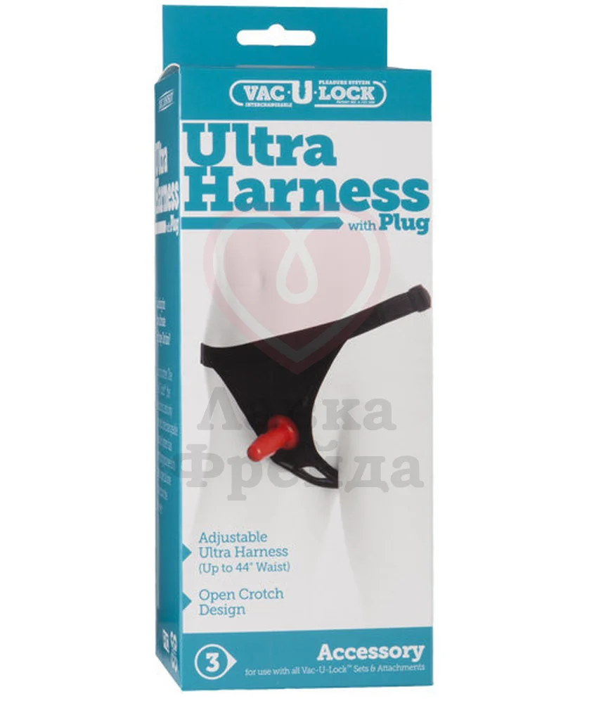 Трусики со штырьком Ultra Harness для фиксации насадок-фаллоимитаторов выполнены из тянущегося материала, который плотно прилегает к бёдрам. Ремешки позволяют регулировать размер, трусики подходят на талию от 50 до 135 см. Есть вырез в интимной зоне.