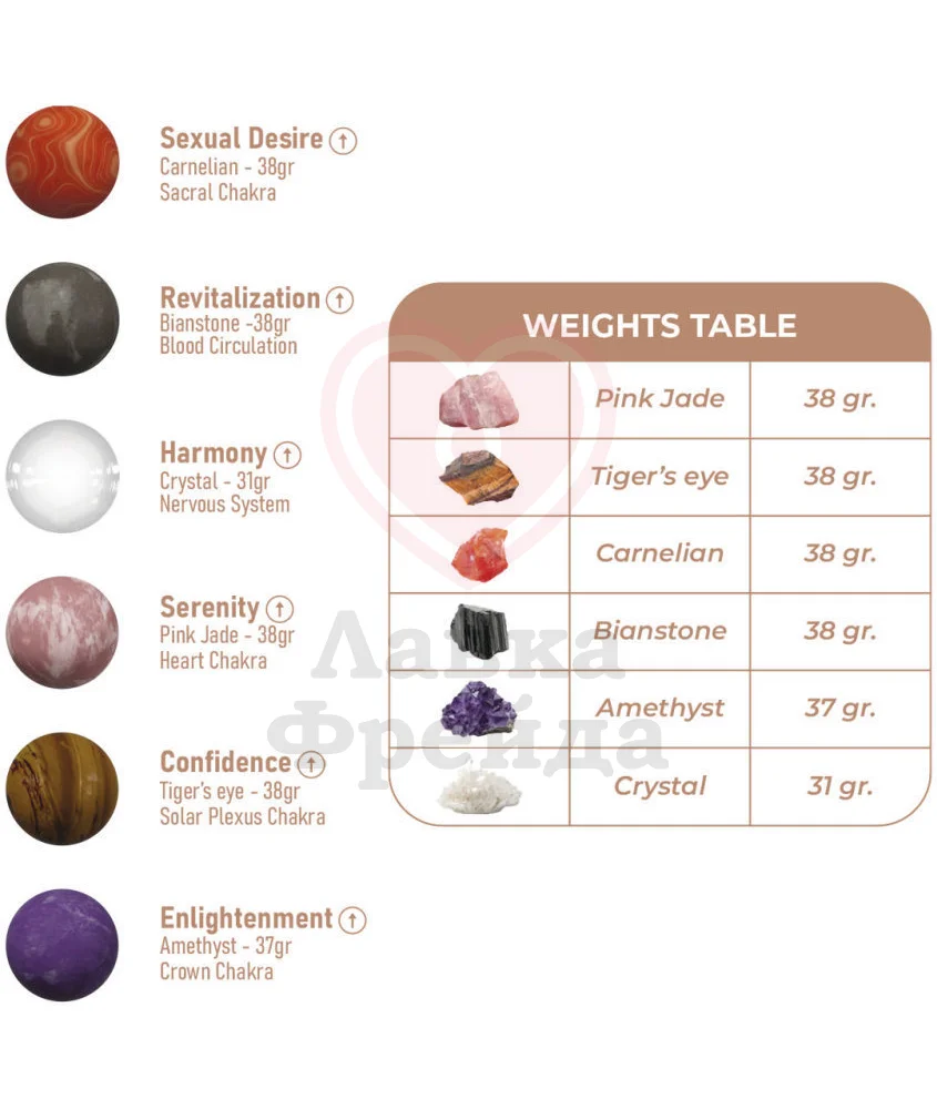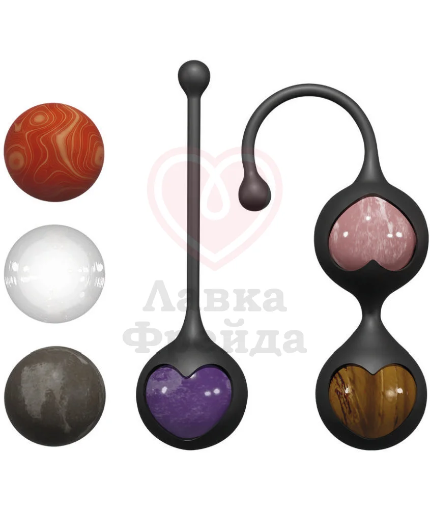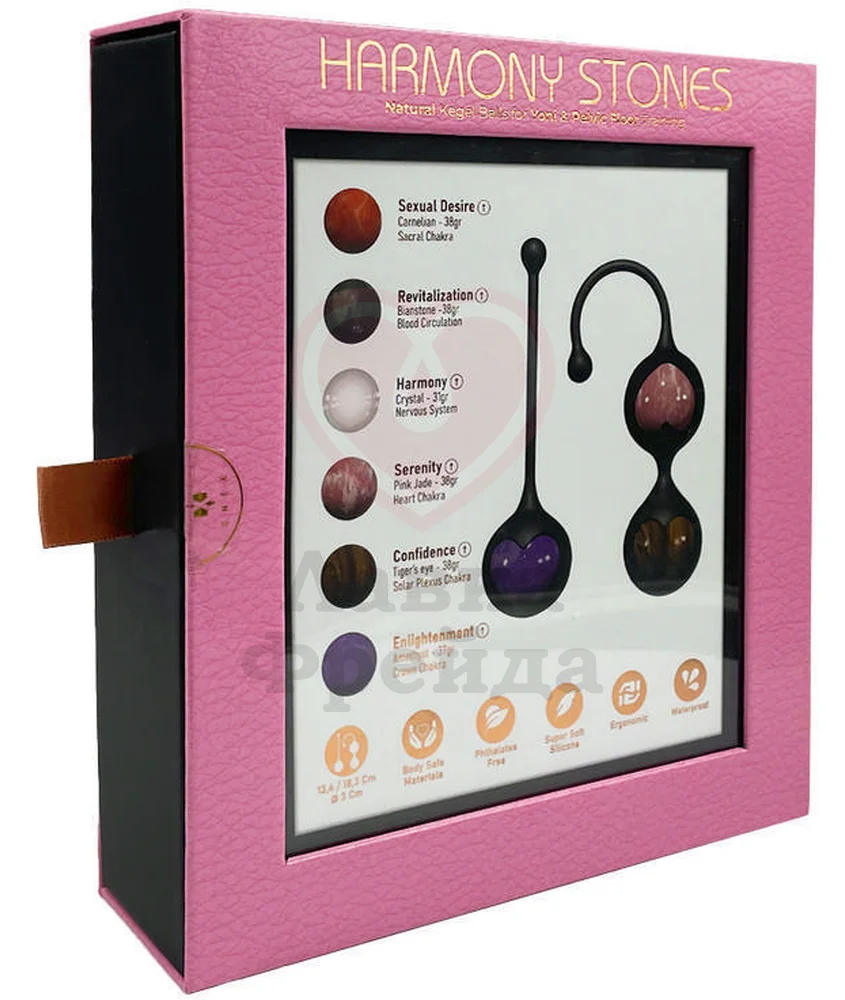 Набор Adrien Lastic Harmony Stones состоит из 6 вагинальных шариков из натуральных минералов и 2-х сцепок ― одинарной и двойной. Все шарики сделаны из разных камней, обладающих разными свойствами: