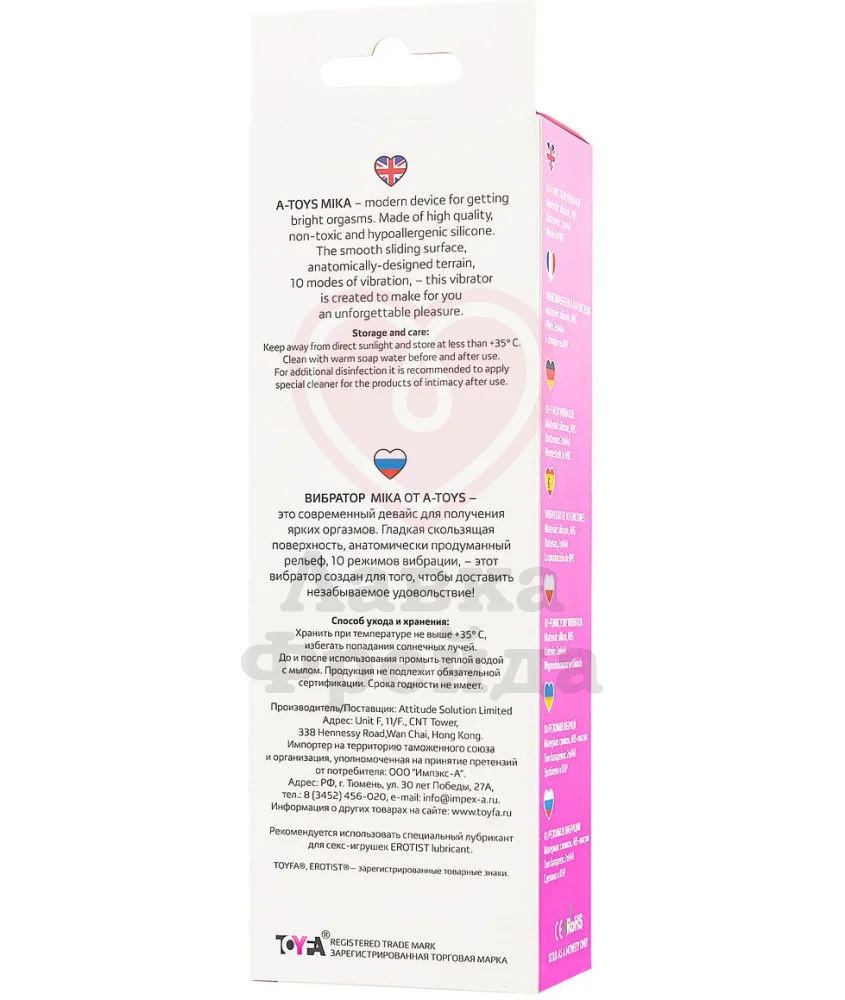 Вибратор A-Toys by Toyfa Mika с анатомически продуманным рельефом подарит ощущение наполненности, а мощный мотор, работающий от двух батареек типа AAA, доставит удовольствие 10 режимами вибрации разной интенсивности. Ярко-розовый шелковистый медицинский силикон - деликатный материал, совместимый с лубрикантами на водной основе.