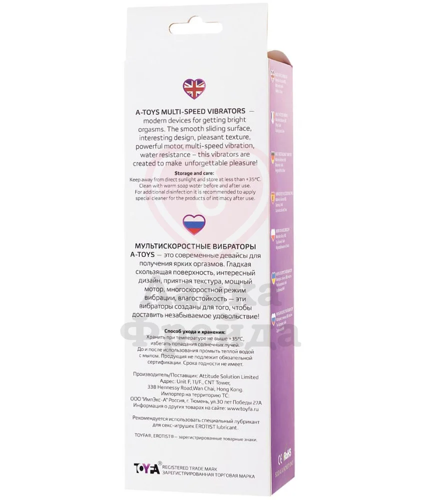 Устойчивость к влаге позволяет недолго использовать вибратор в душе, однако недопустимо его полное погружение в воду. Шелковистый медицинский силикон совместим с лубрикантами только на водной основе. Для очистки используйте тёплый мыльный раствор и специализированный антибактериальный спрей для игрушек.
