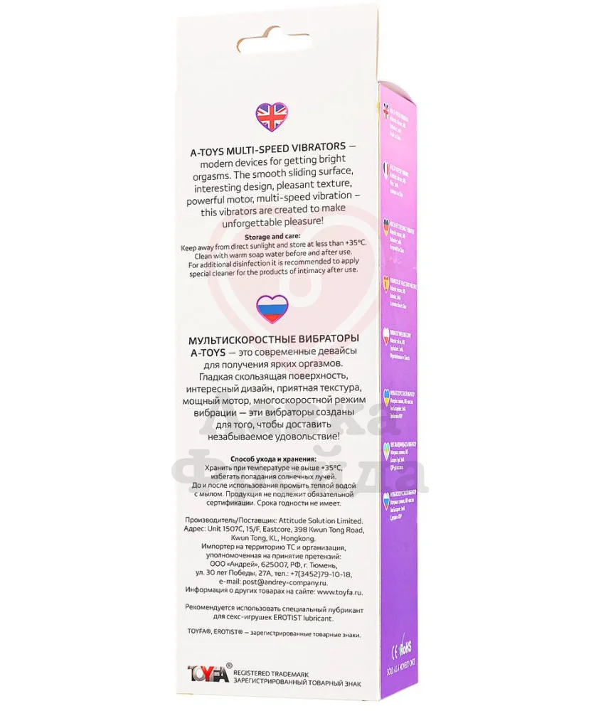 Изготовлен из шелковистого, ярко-фиолетового медицинского силикона - тактильно приятный, деликатный материал, совместимый с лубрикантами только на водной основе. Для очистки используйте тёплый мыльный раствор и специализированный антибактериальный спрей для игрушек.