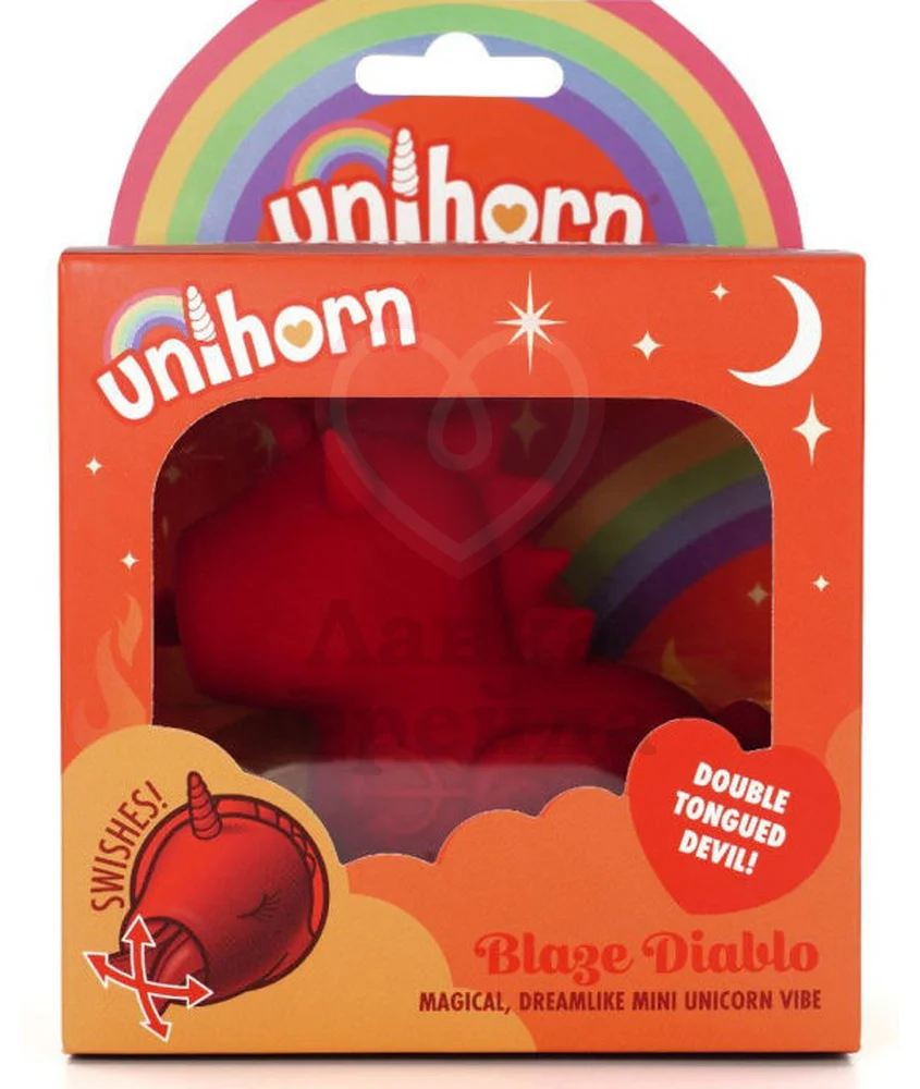Ярко-красный вибратор Unihorn Blaze Diablo сделан в виде миниатюрного адского единорога, который будет стимулировать ваш клитор 20 комбинируемыми режимами вибрации и движениями раздвоенного язычка. Чтобы игра была еще приятнее, используйте лубрикант на водной основе.