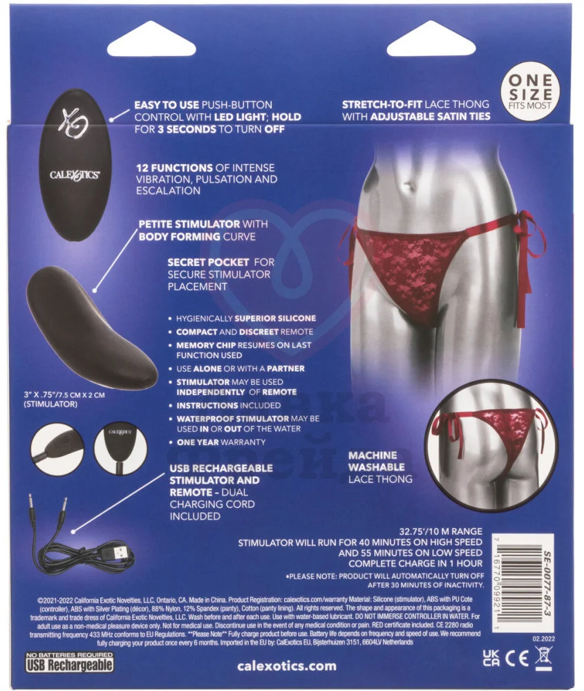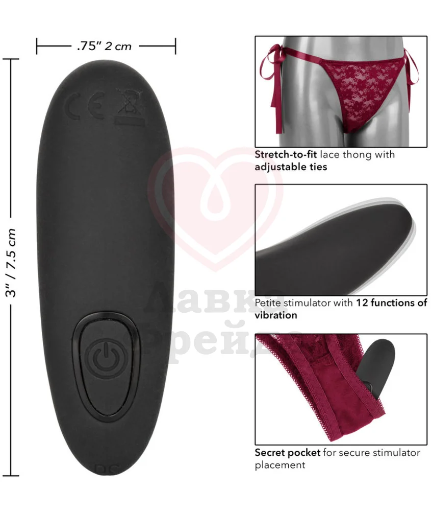 Control Lace Thong Set - это сексуальный комплект, состоящий из соблазнительных кружевных трусиков с атласными завязками по бокам и миниатюрного вибратора с 12 режимами работы, контролировать который можно как кнопкой на корпусе самой игрушки, так и пультом ДУ, с радиусом действия до 10 метров. Вибратор вставляется в специальный внутренний кармашек на белье. Трусики можно стирать в стиральной машине.